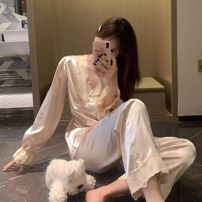 2024新款春秋季真丝睡衣女套装性感蕾丝花边长袖长裤桑蚕丝家居