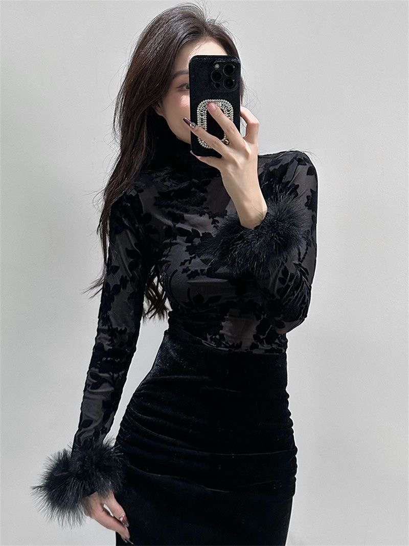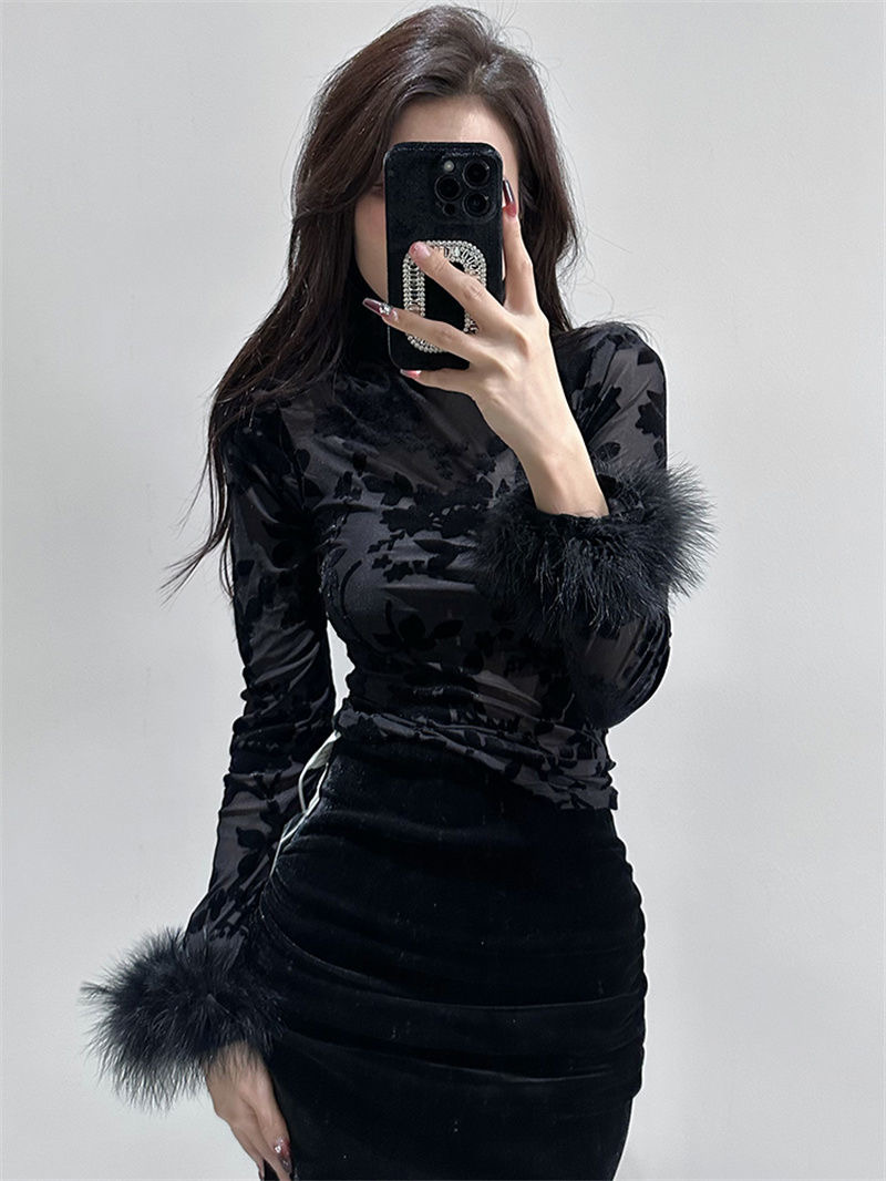 韩版植绒拼接毛毛袖半高领长袖T恤打底衫女新款纯欲显瘦黑色上衣