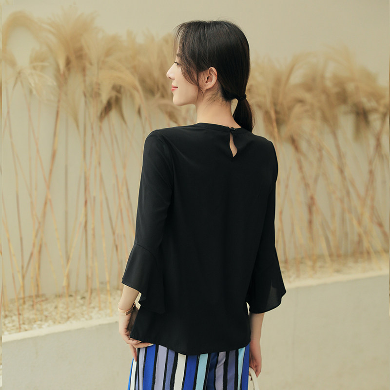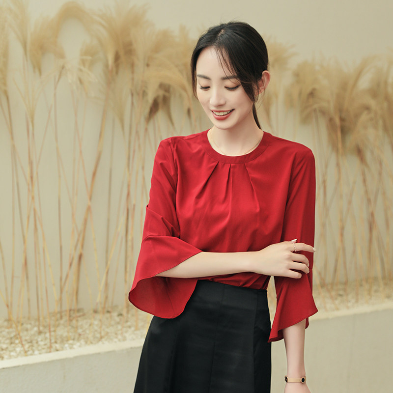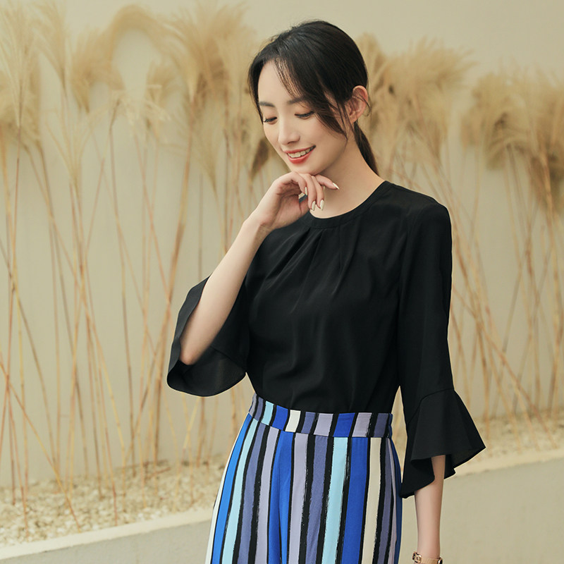 凯喜雅百搭风喇叭袖压褶真丝衬衫