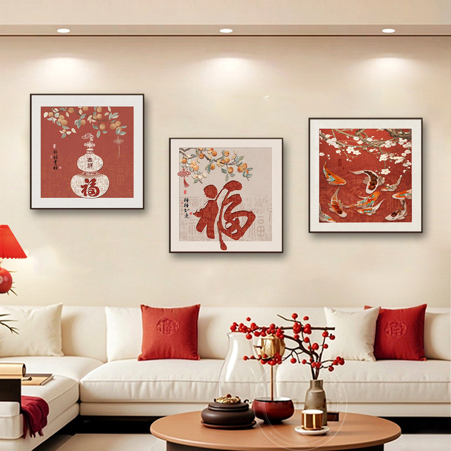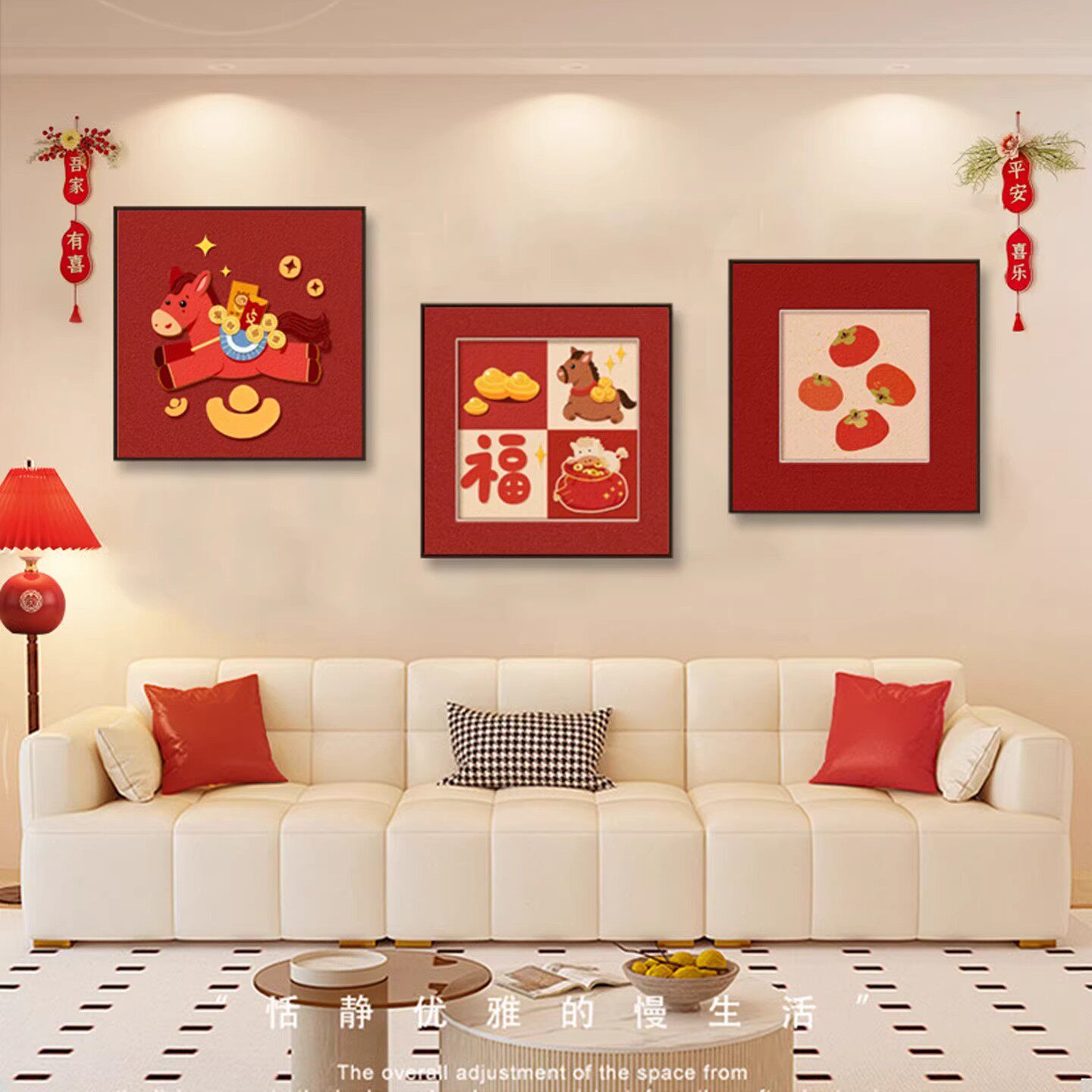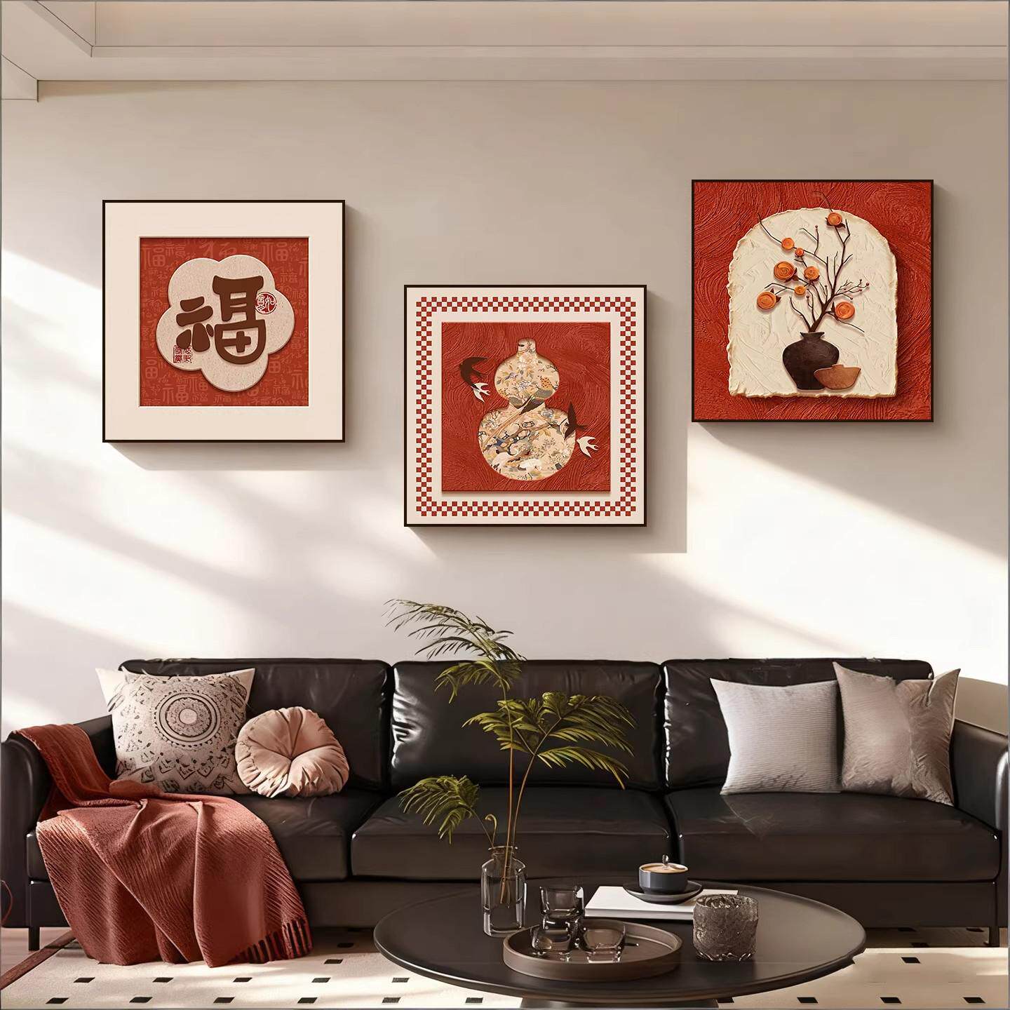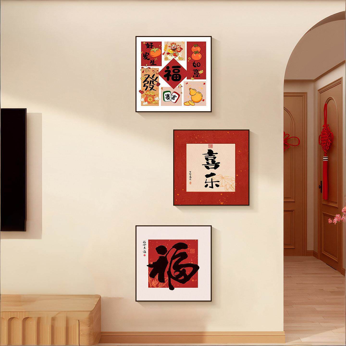 柿柿如意沙发背景墙装饰画2026马年喜庆福字客厅壁画高级三联挂画