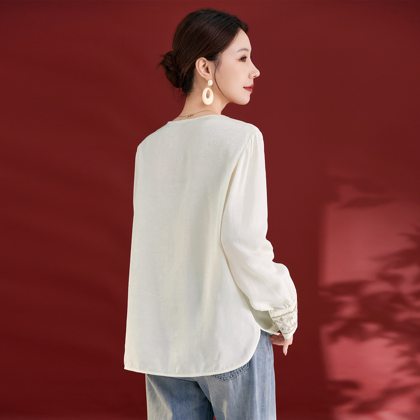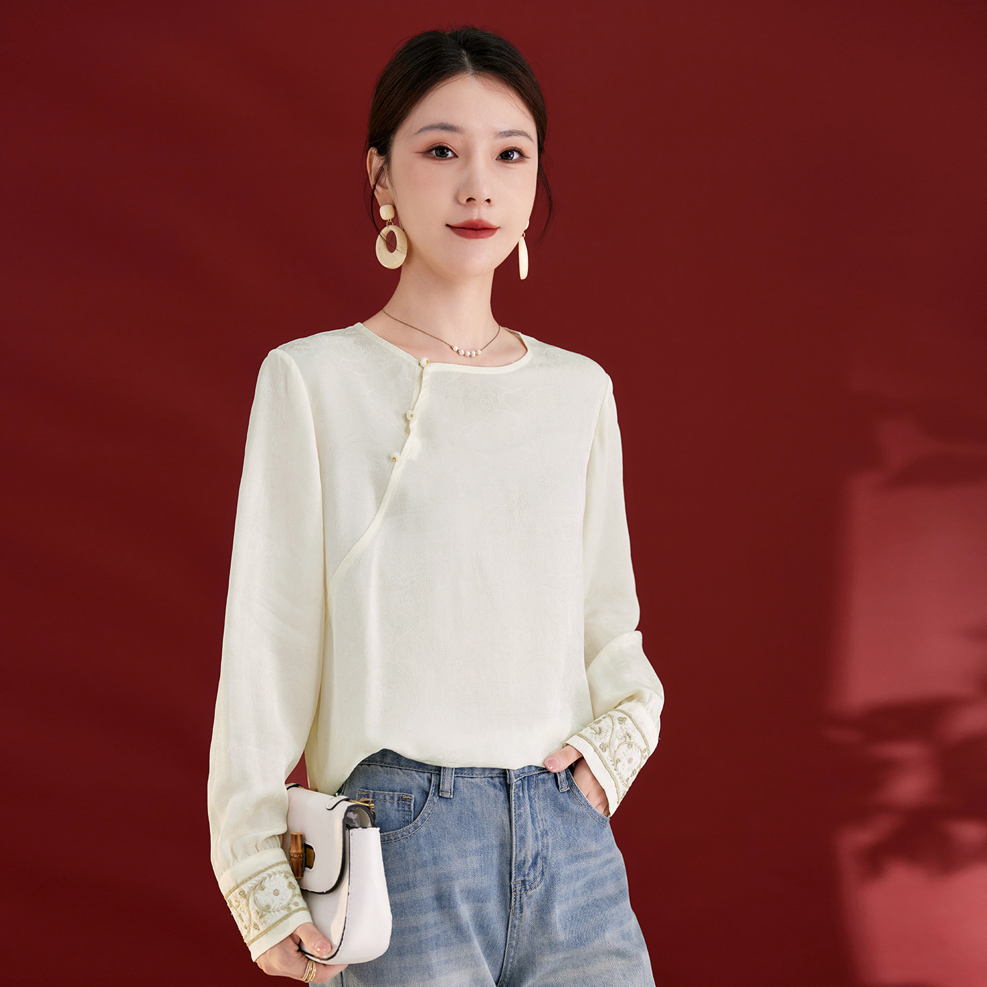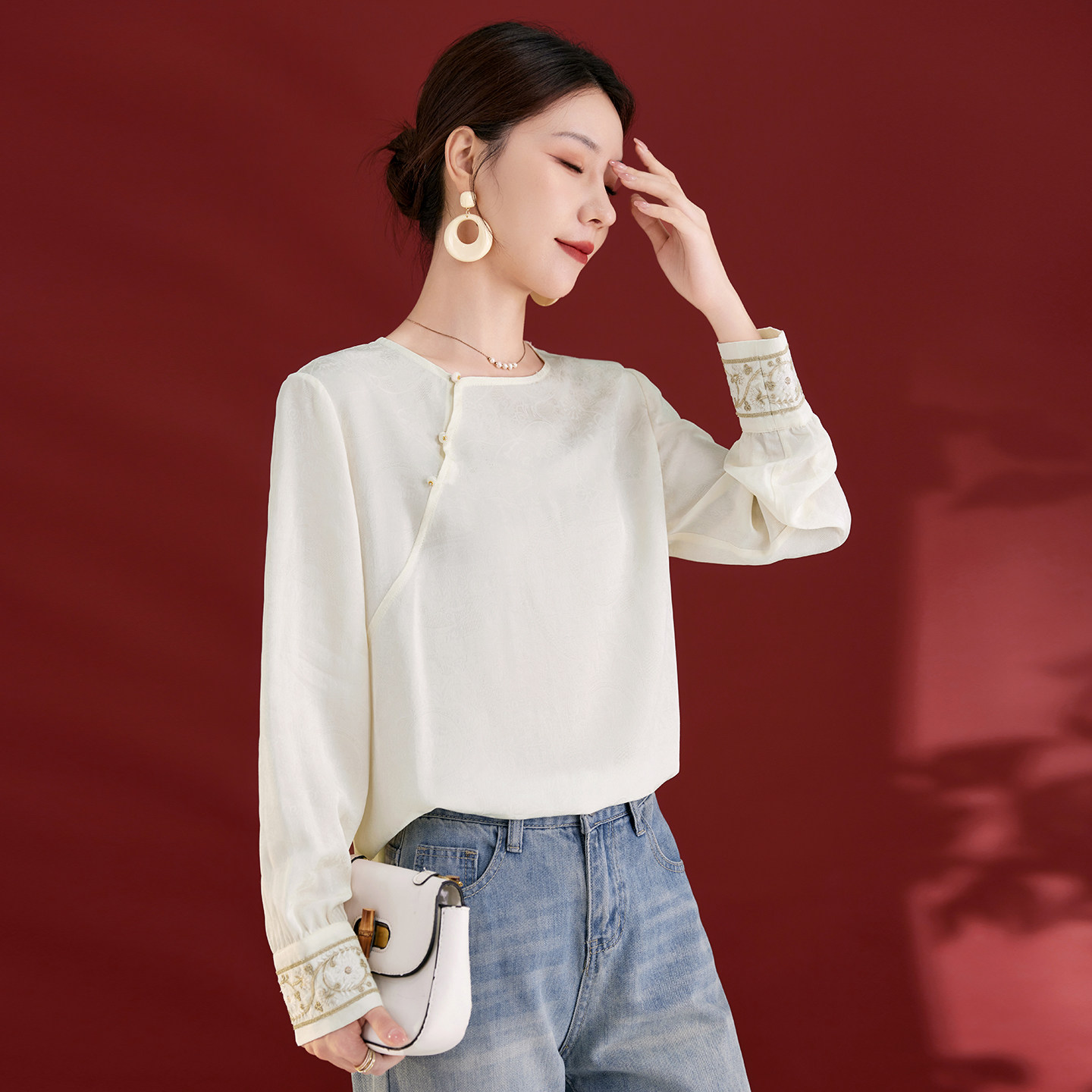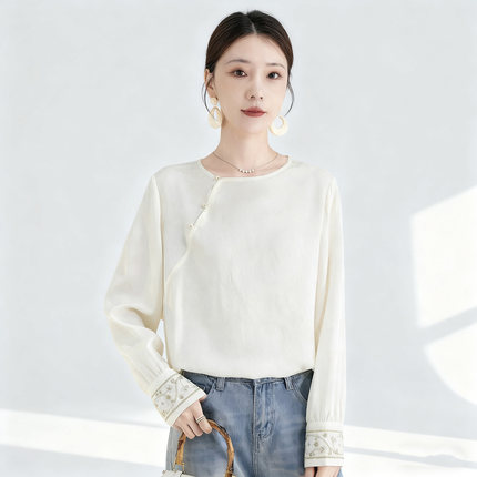 水墨佳人2025新款真丝女装优质桑蚕丝上衣轻奢长袖新中式圆领衬衫