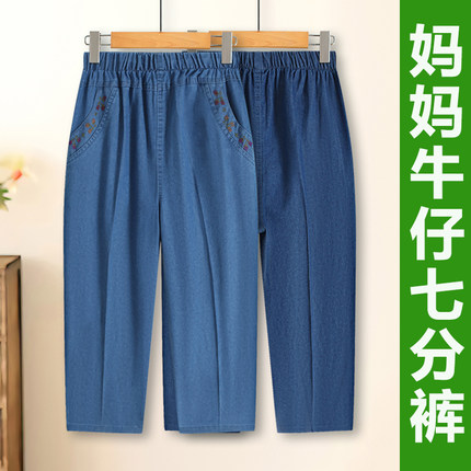 中老年女裤妈妈夏季薄款牛仔裤大码七分裤奶奶松紧高腰老奶奶裤子