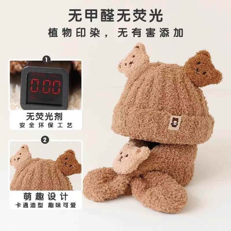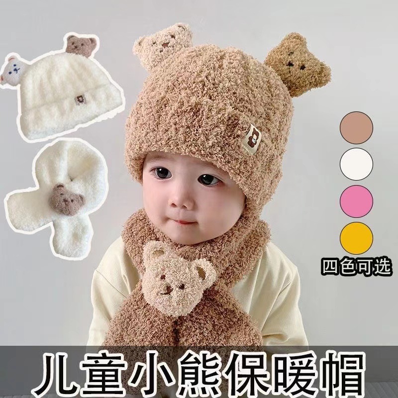 宝宝冬天小熊帽子围巾套装可爱超萌婴幼儿童毛绒男女童保暖毛线帽