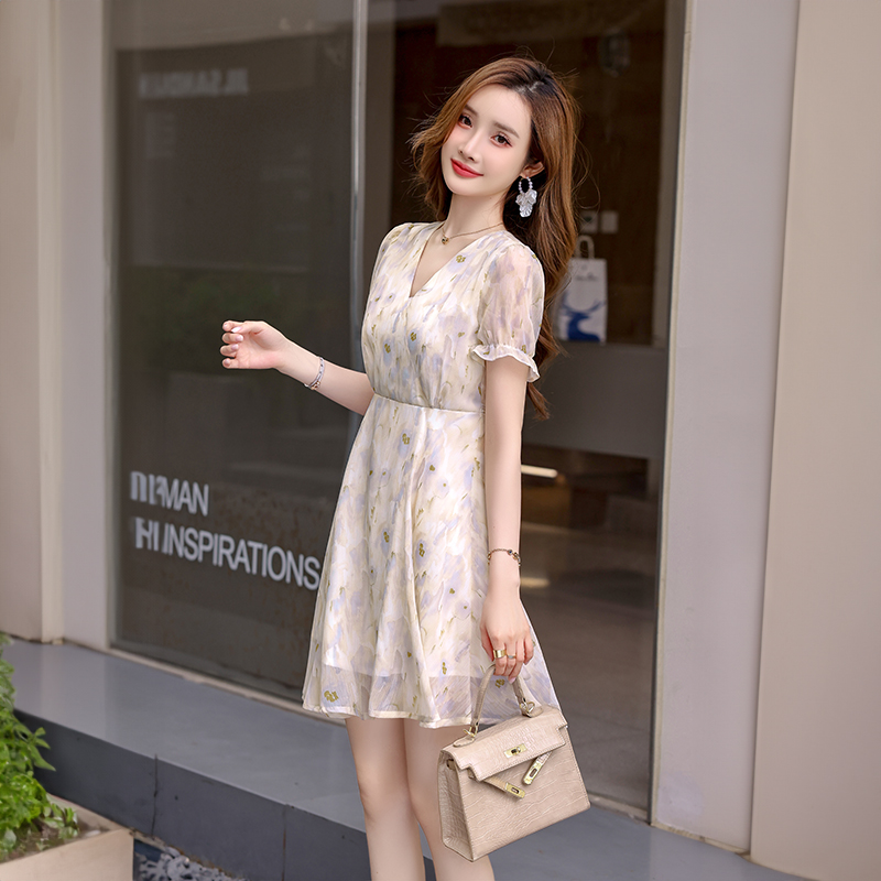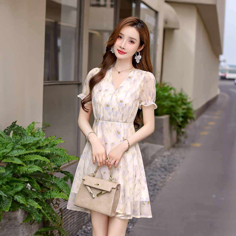 2025夏季新款女装时尚气质小个子显高碎花雪纺连衣裙短袖a字裙子