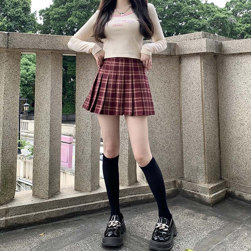 红色格子百褶裙女短款高腰美式复古春秋磨毛a字半身裙显瘦短裙裤