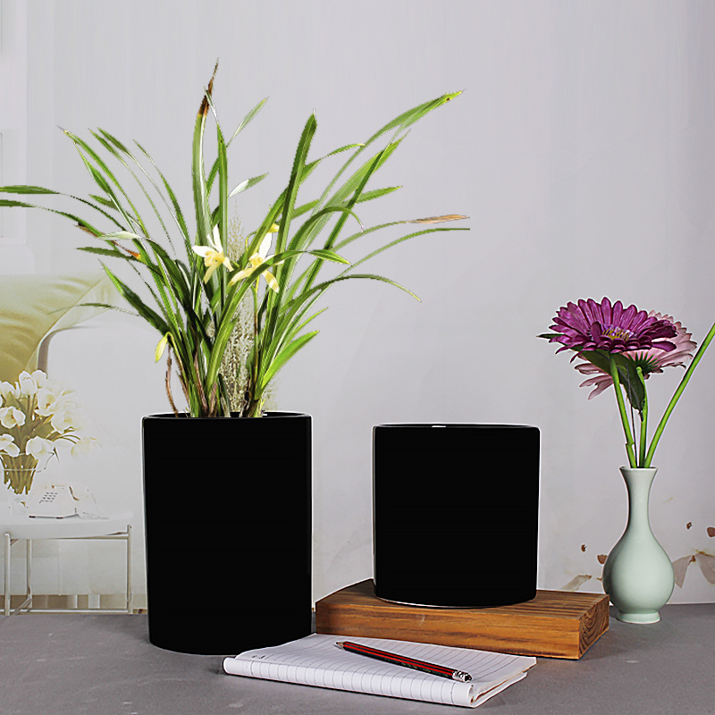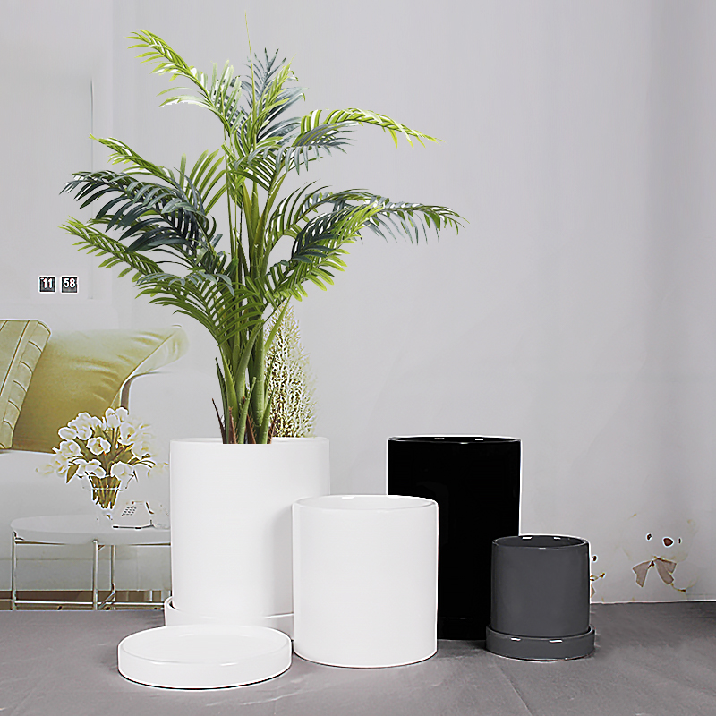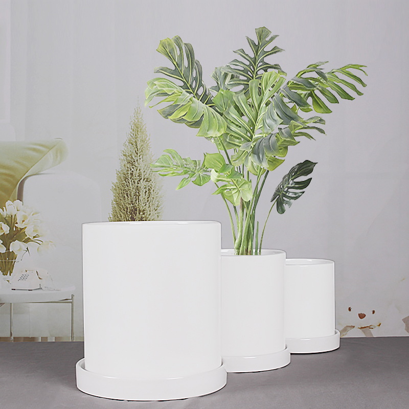 圆柱陶瓷花盆白色带托盘特大号创意简约绿植绿萝吊兰高圆直筒花盆