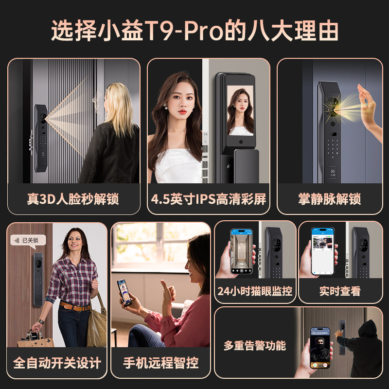 小益3D人脸识别智能锁指纹电子密码锁掌静脉家用防盗夜视可视监控