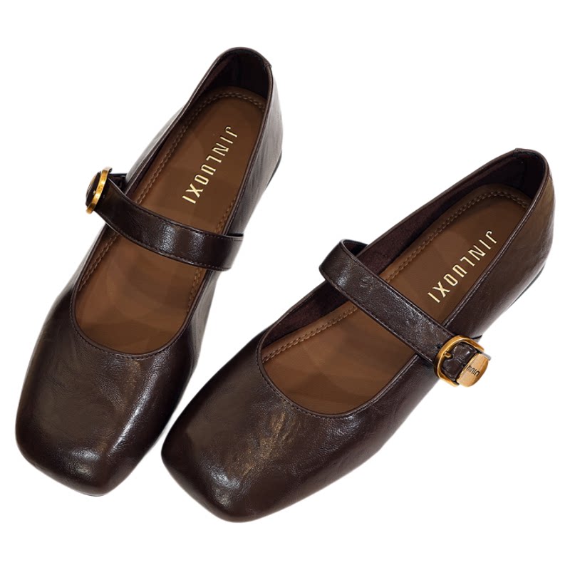 显脚小玛丽珍鞋女2025秋季新款百搭一字带平底单鞋子咖啡色小皮鞋
