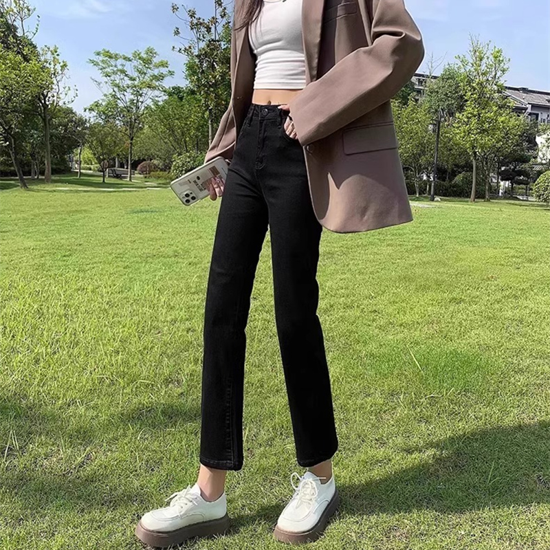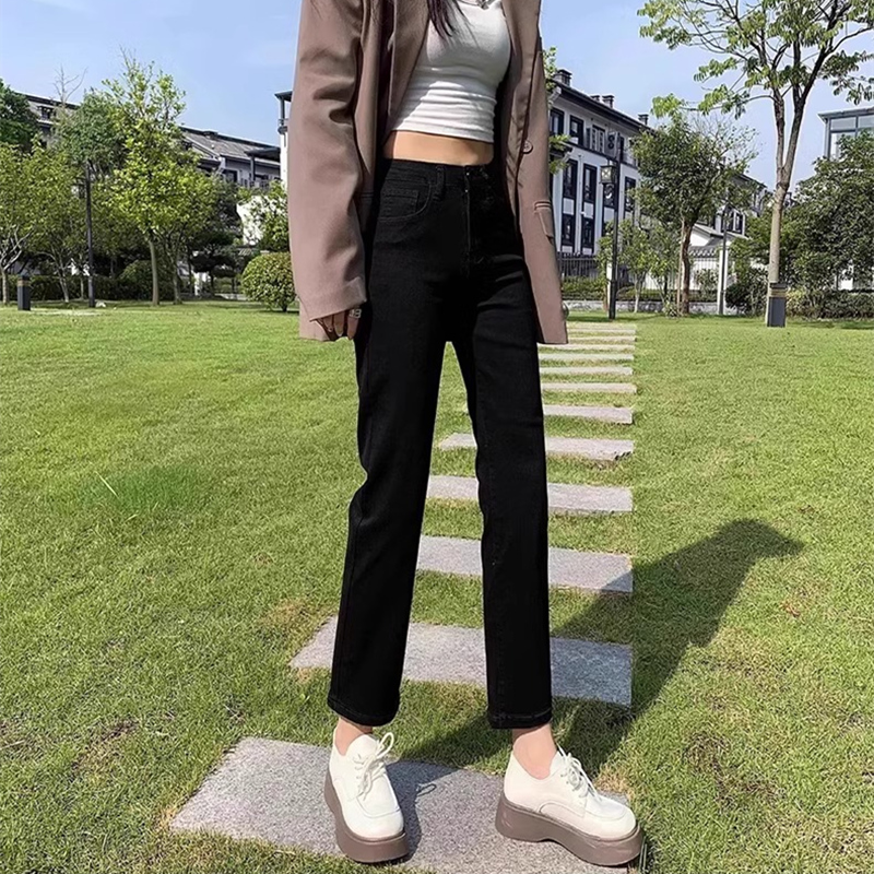 黑色高腰修身直筒牛仔裤女夏2025年春秋新款小个子八九分烟管裤子