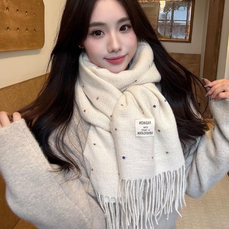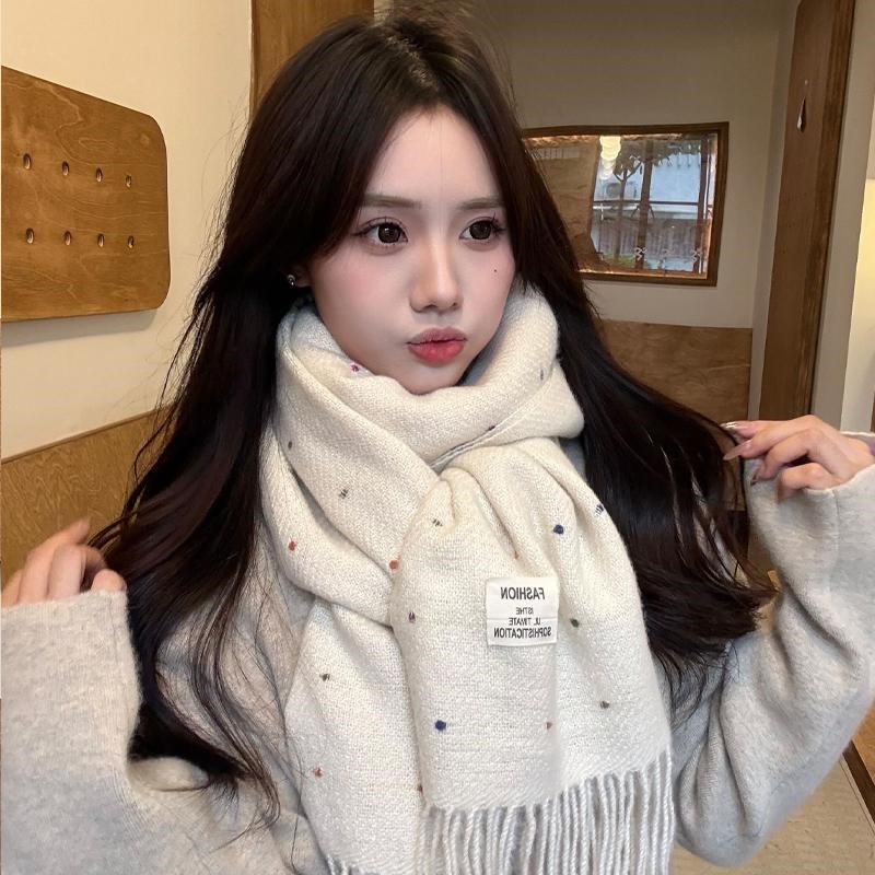 米白色围巾女秋冬季高级感百搭围脖韩版学生情侣波点保暖披肩两用