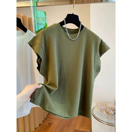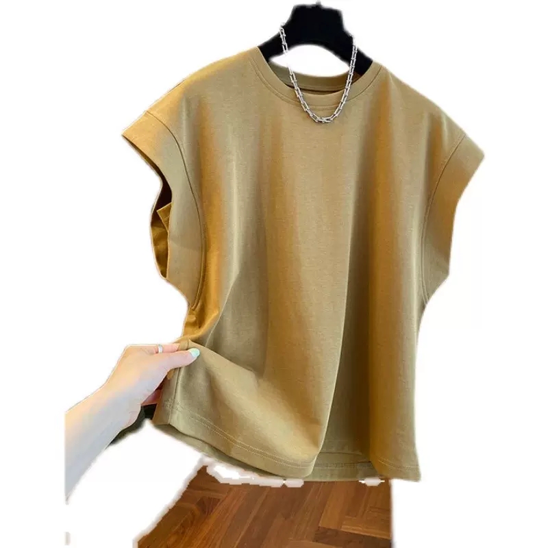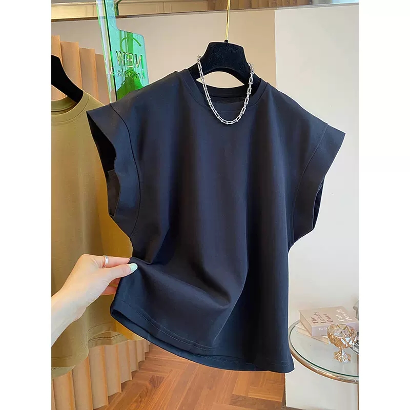 品牌折扣专柜外贸女装夏季T恤女短袖宽松纯棉无袖体恤落肩袖上衣