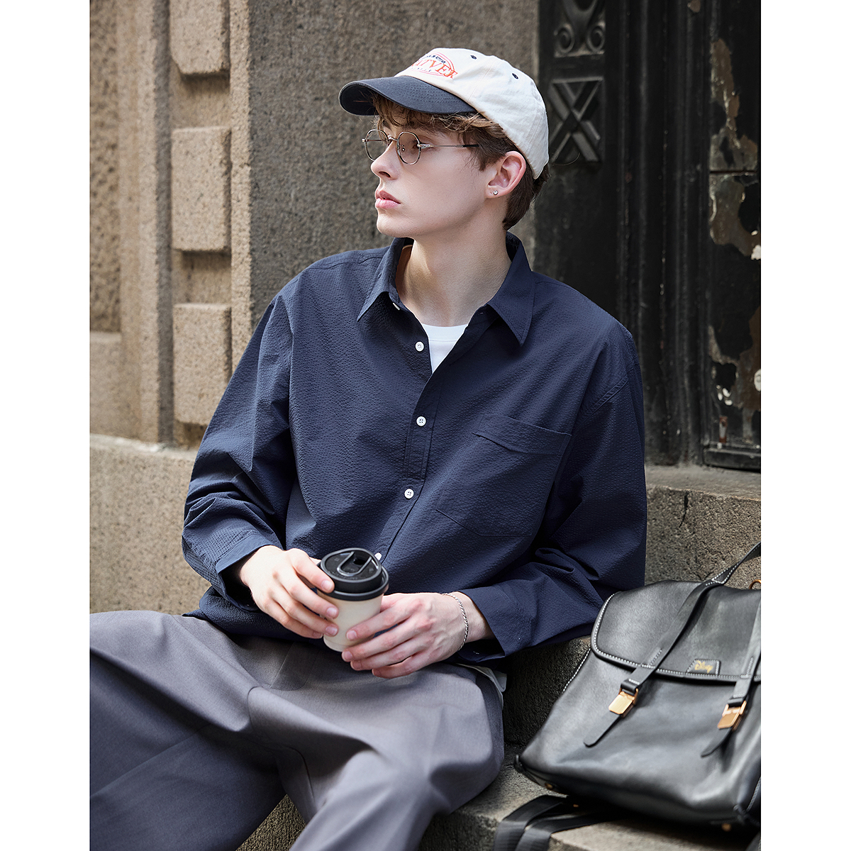 唐狮2025秋季男款长袖衬衫翻领泡泡纱纯色薄款衬衫休闲时尚通勤风