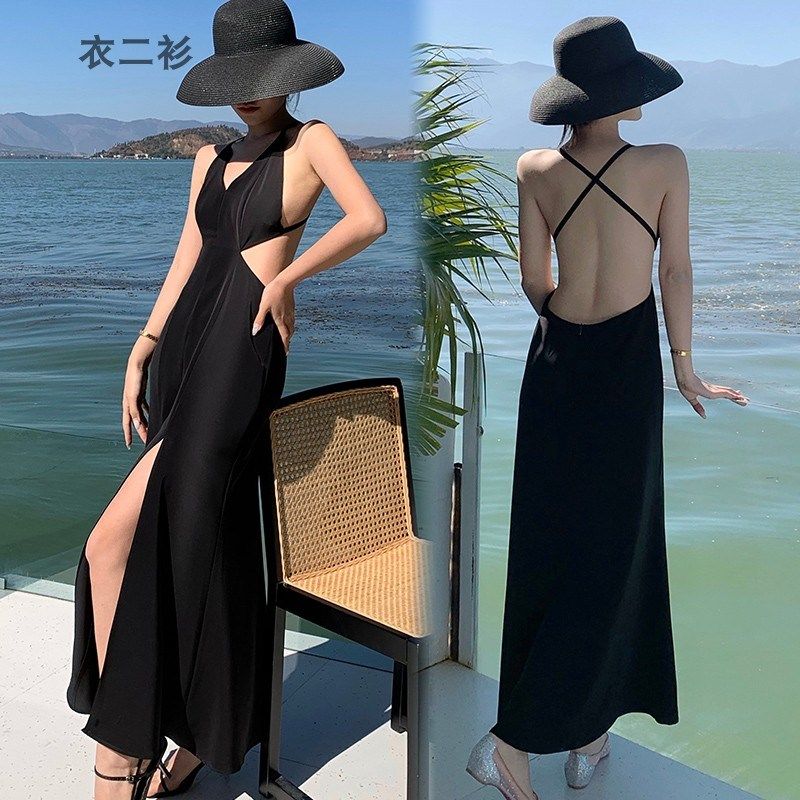三亚海边度假吊带沙滩裙显瘦气质小个子中长款宴会礼服黑色连衣裙