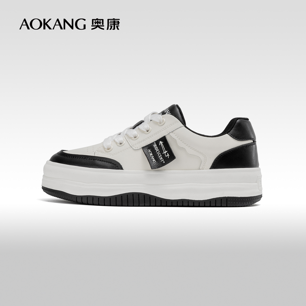 奥康 女鞋春秋季厚底休闲板鞋拼色圆头青春时尚系带面包鞋