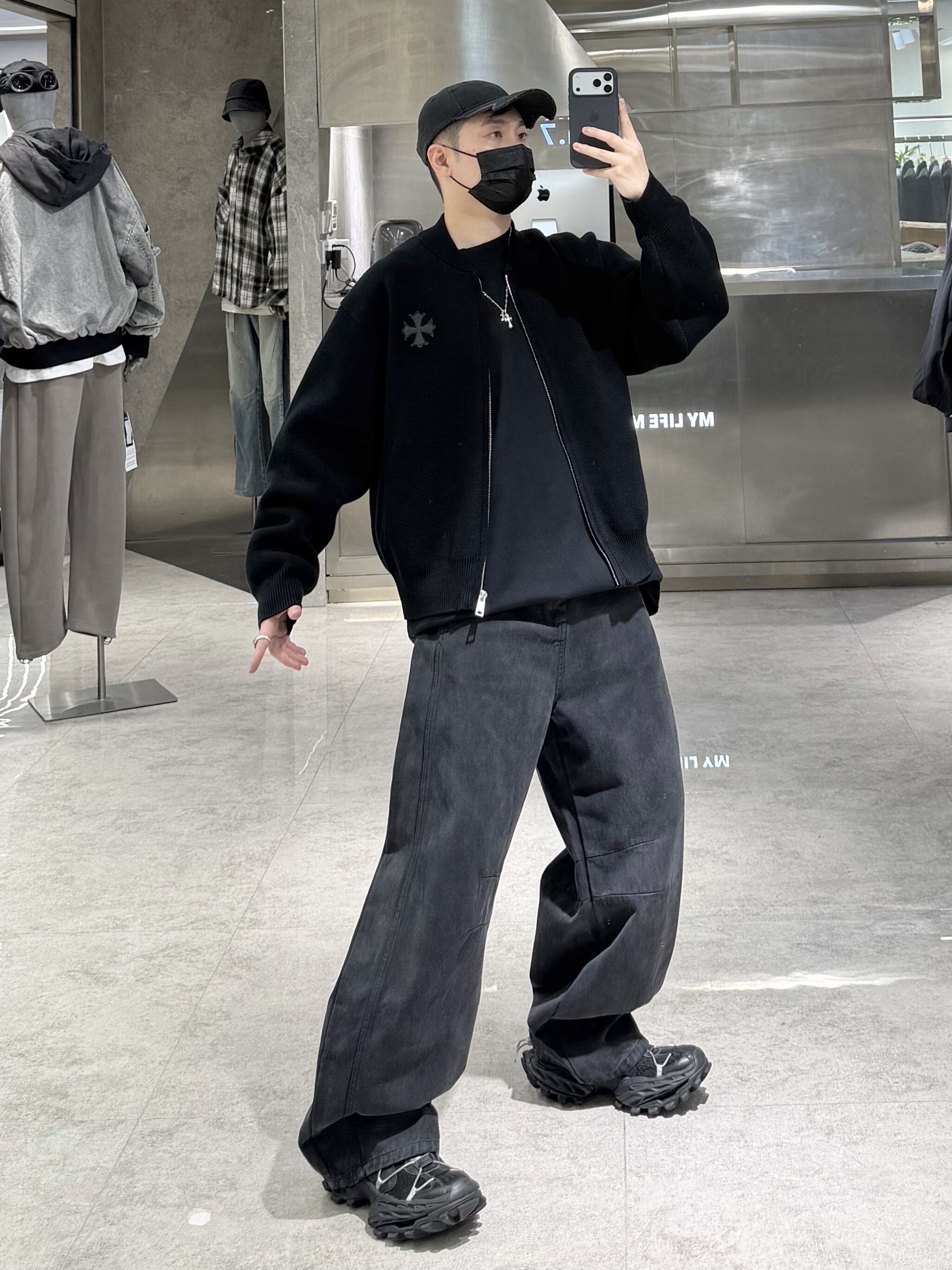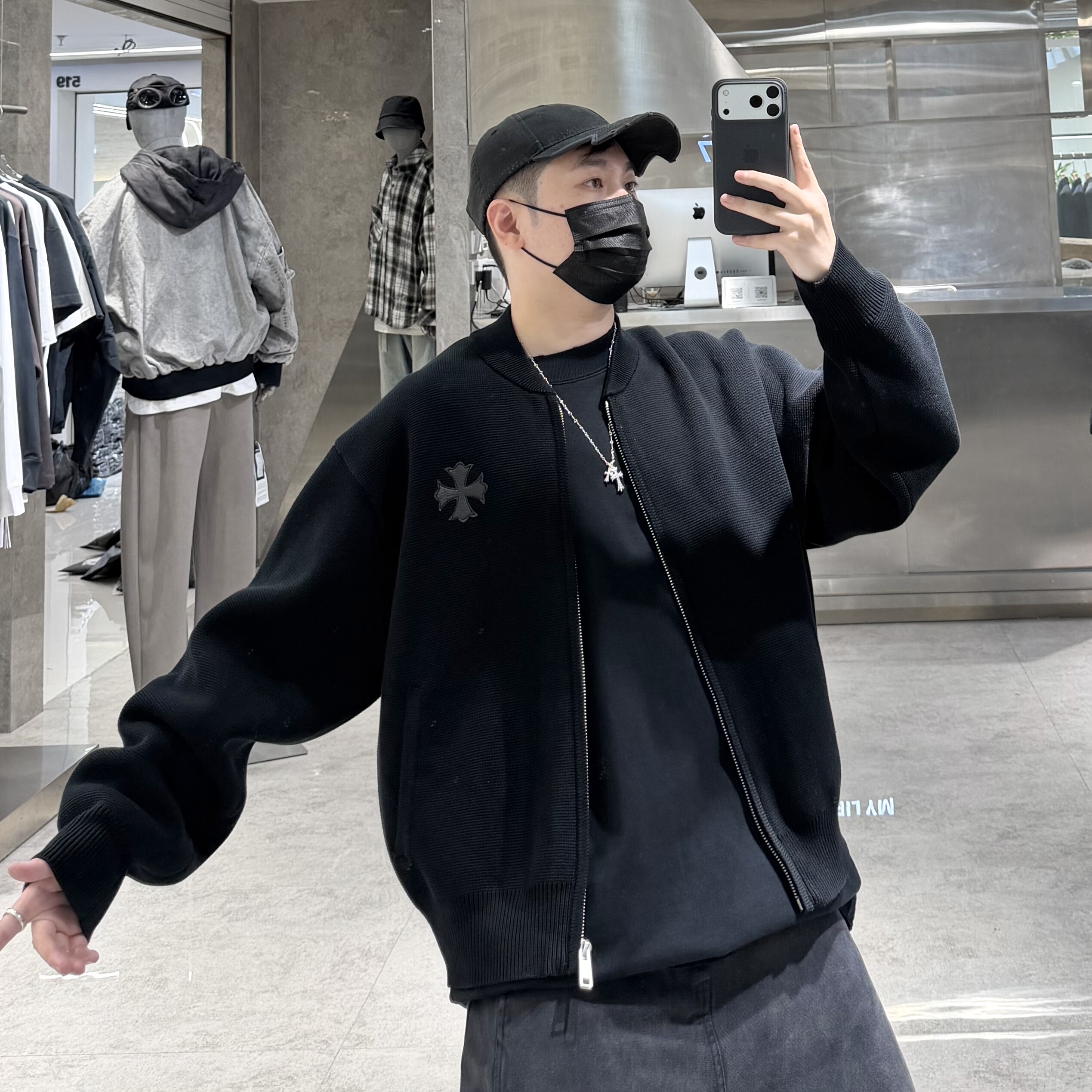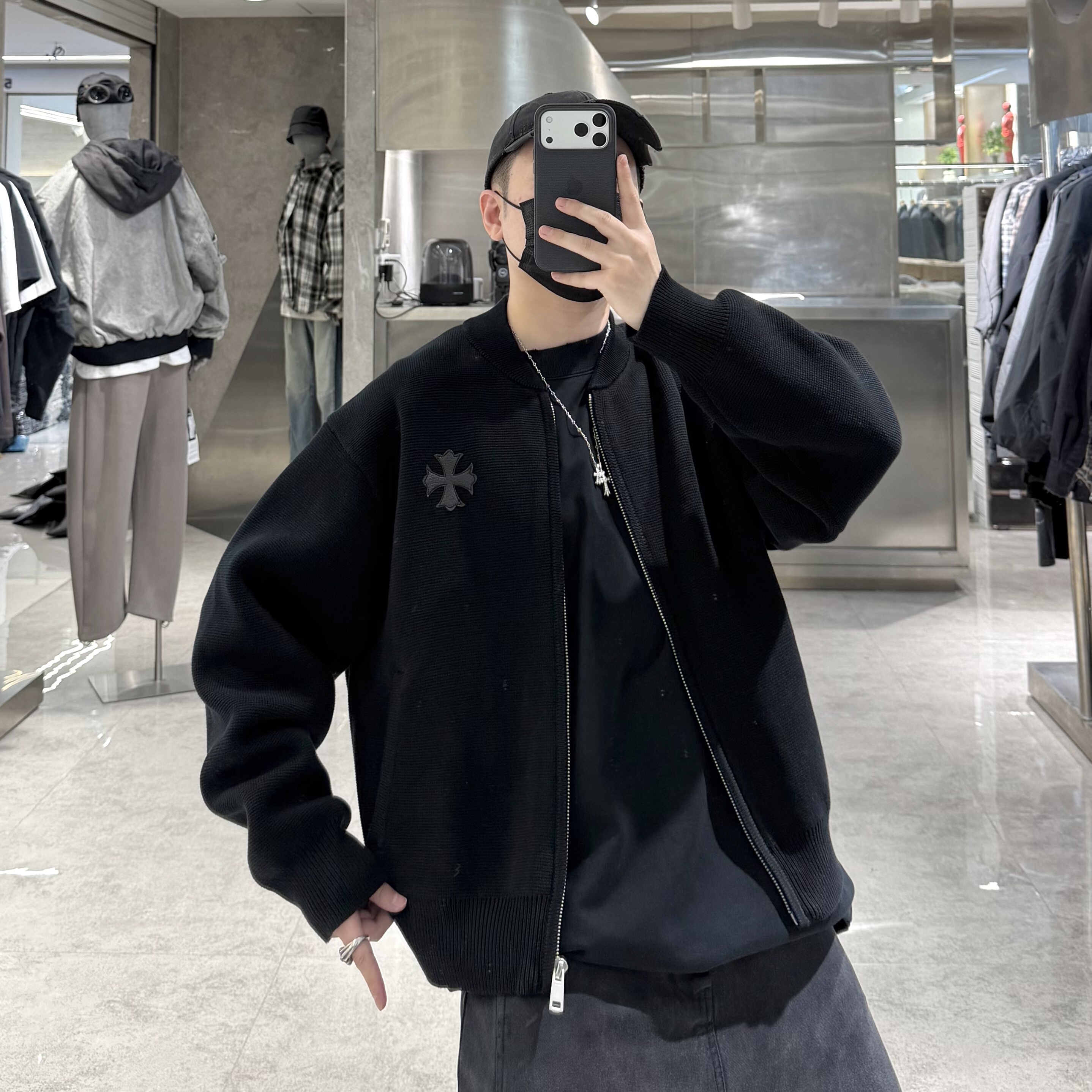 潮牌秋冬重磅针织开衫男ins美式十字架刺绣宽松青年帅气毛衣外套