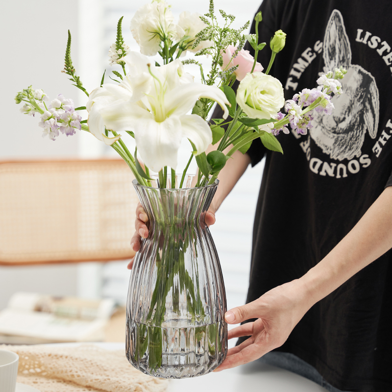 ins风网红敞口条纹花瓶玻璃透明水培客厅餐桌插花花瓶装饰品摆件
