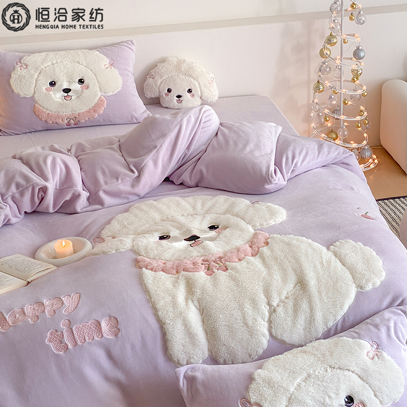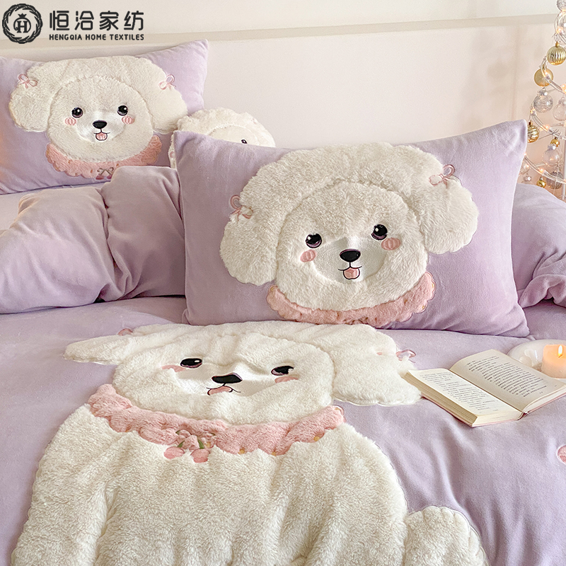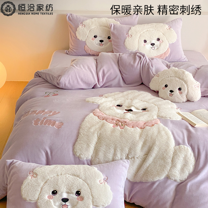 冬季儿童230g加厚牛奶绒四件套卡通风刺绣珊瑚绒被套床品1.2床笠