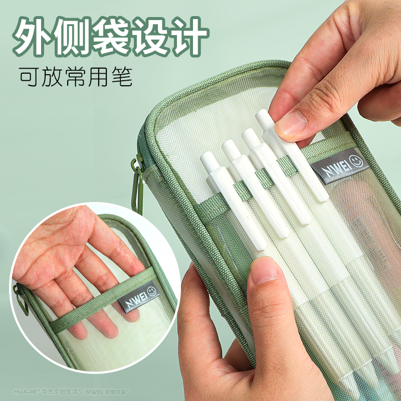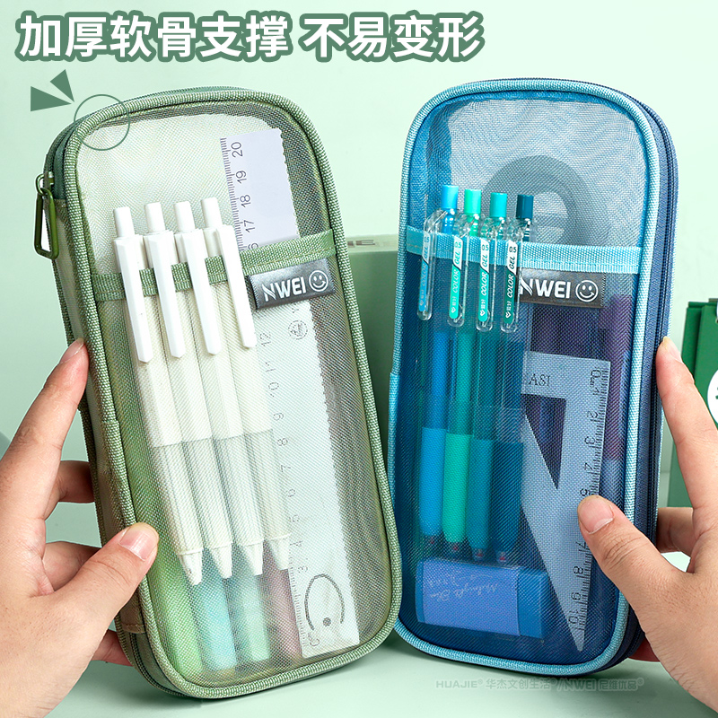 华杰透明网纱笔袋考试专用袋子初中女生文具袋男孩款高颜值ins风小学生简约铅笔盒大容量多功能化妆品收纳袋