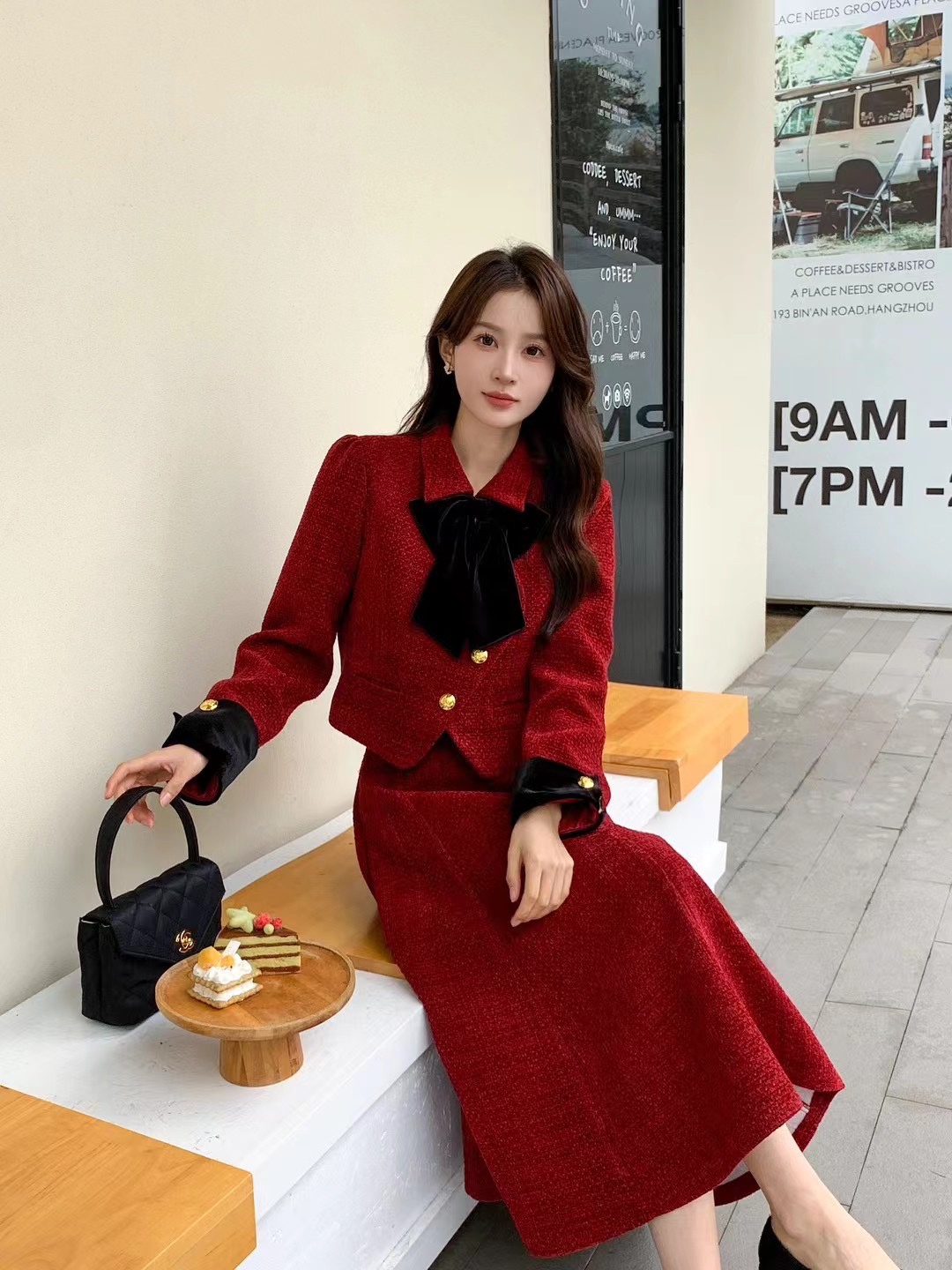 红色小香风套装裙两件套