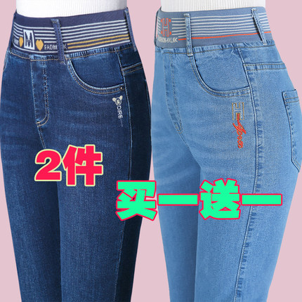 高腰薄款弹力女士长裤新款松紧腰牛仔裤女直筒裤中年妈妈大码女裤