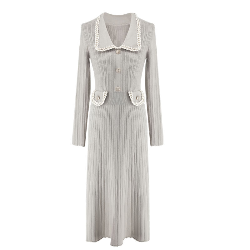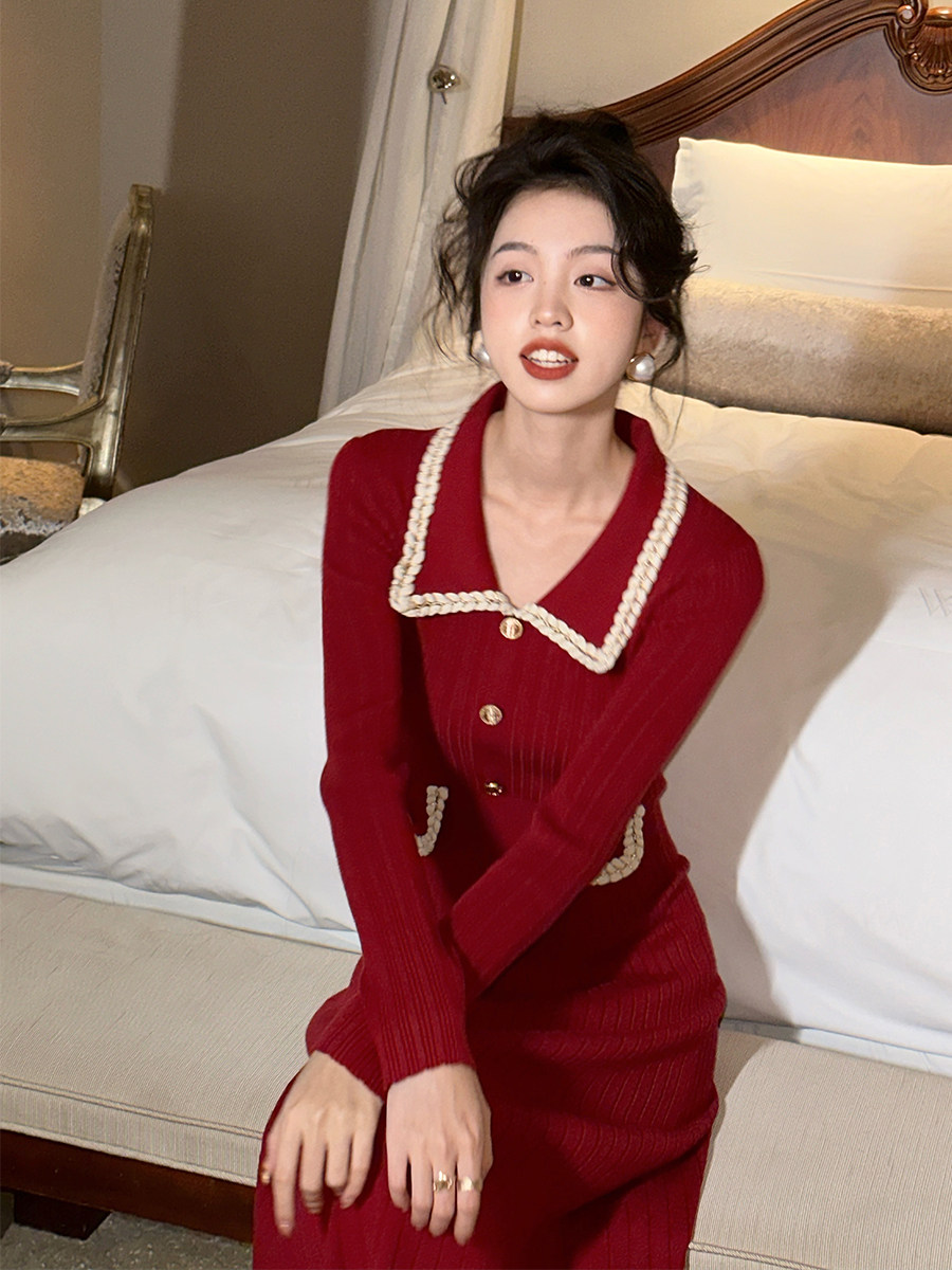 SYT俏皮可爱 小香风翻领显瘦针织连衣裙女秋冬设计感高腰打底长裙