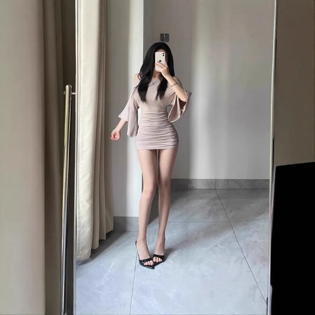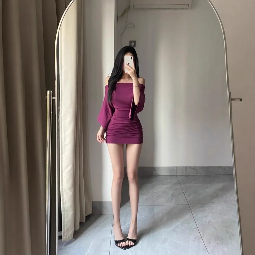 5619潮尚修身收腰显瘦一字肩褶皱两穿连衣裙春夏季喇叭袖包臀短裙