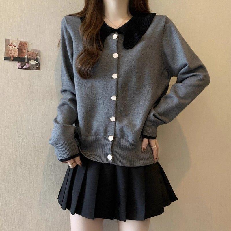 韩版娃娃领拼接针织长袖T恤女夏夏大码胖MM宽松显瘦洋气开衫上衣
