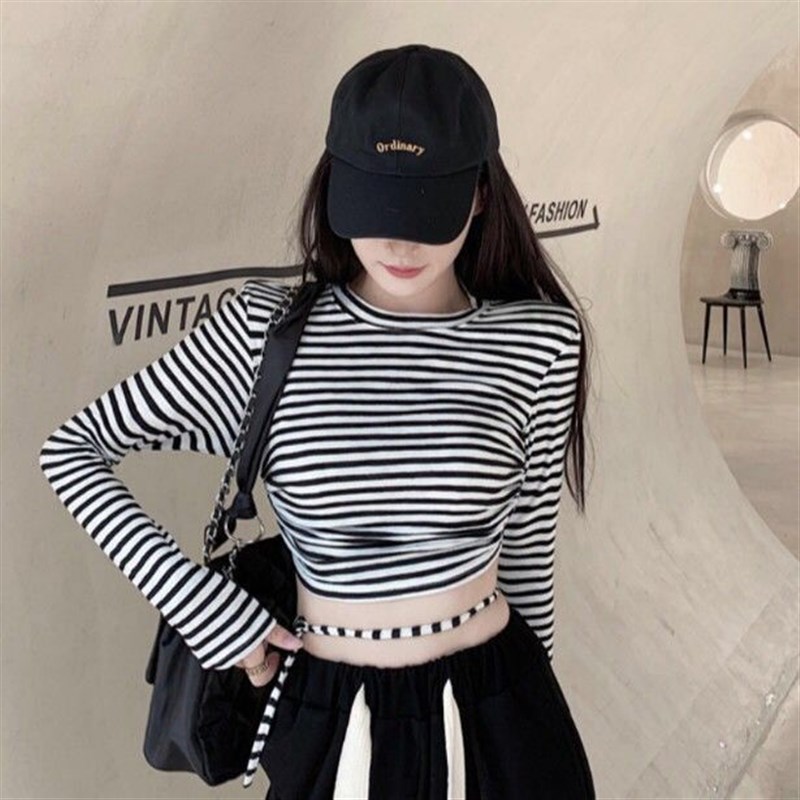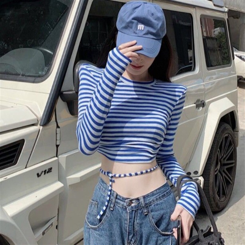 今年流行的条纹t恤长袖女氛围感撞色上衣高腰露脐短款打底衫秋款