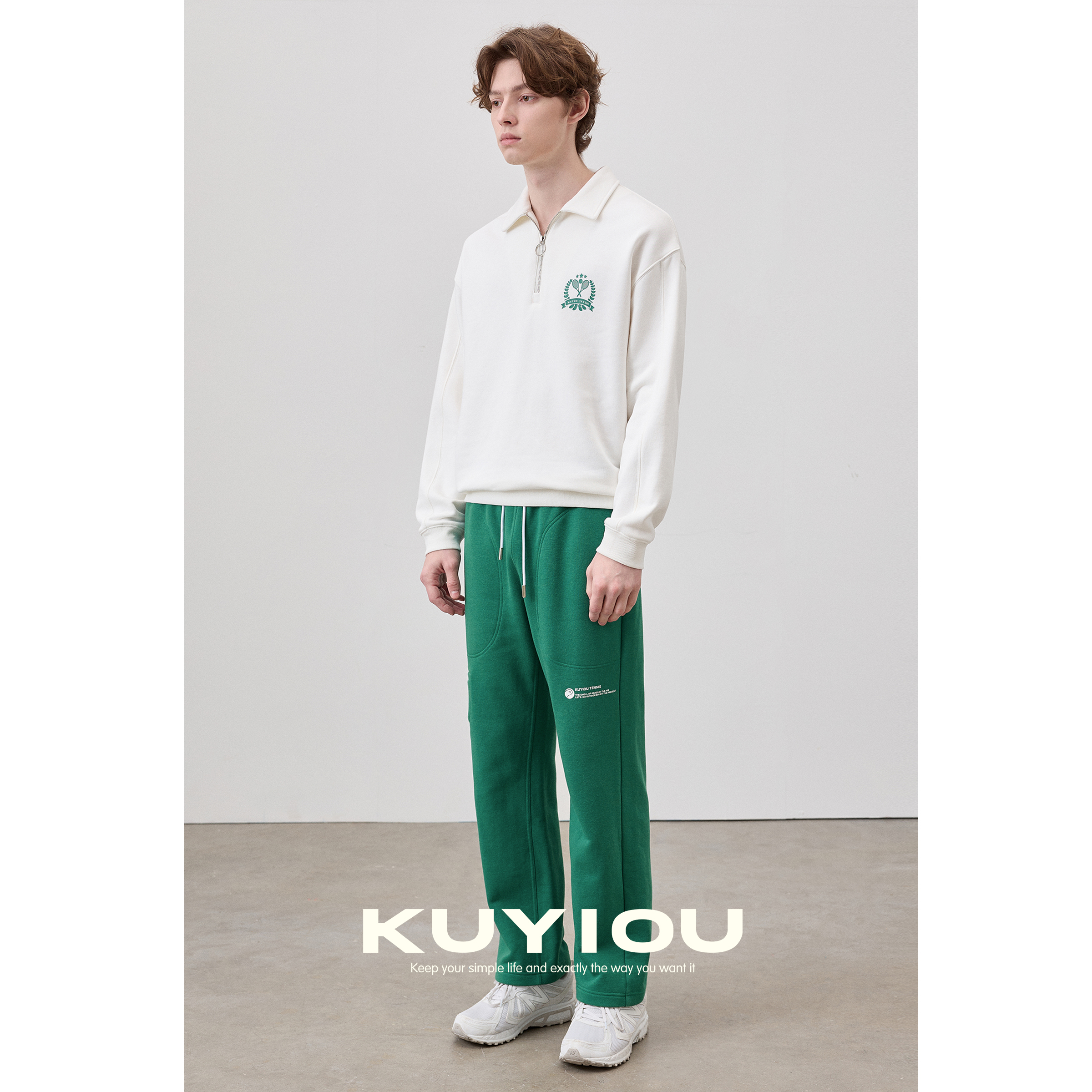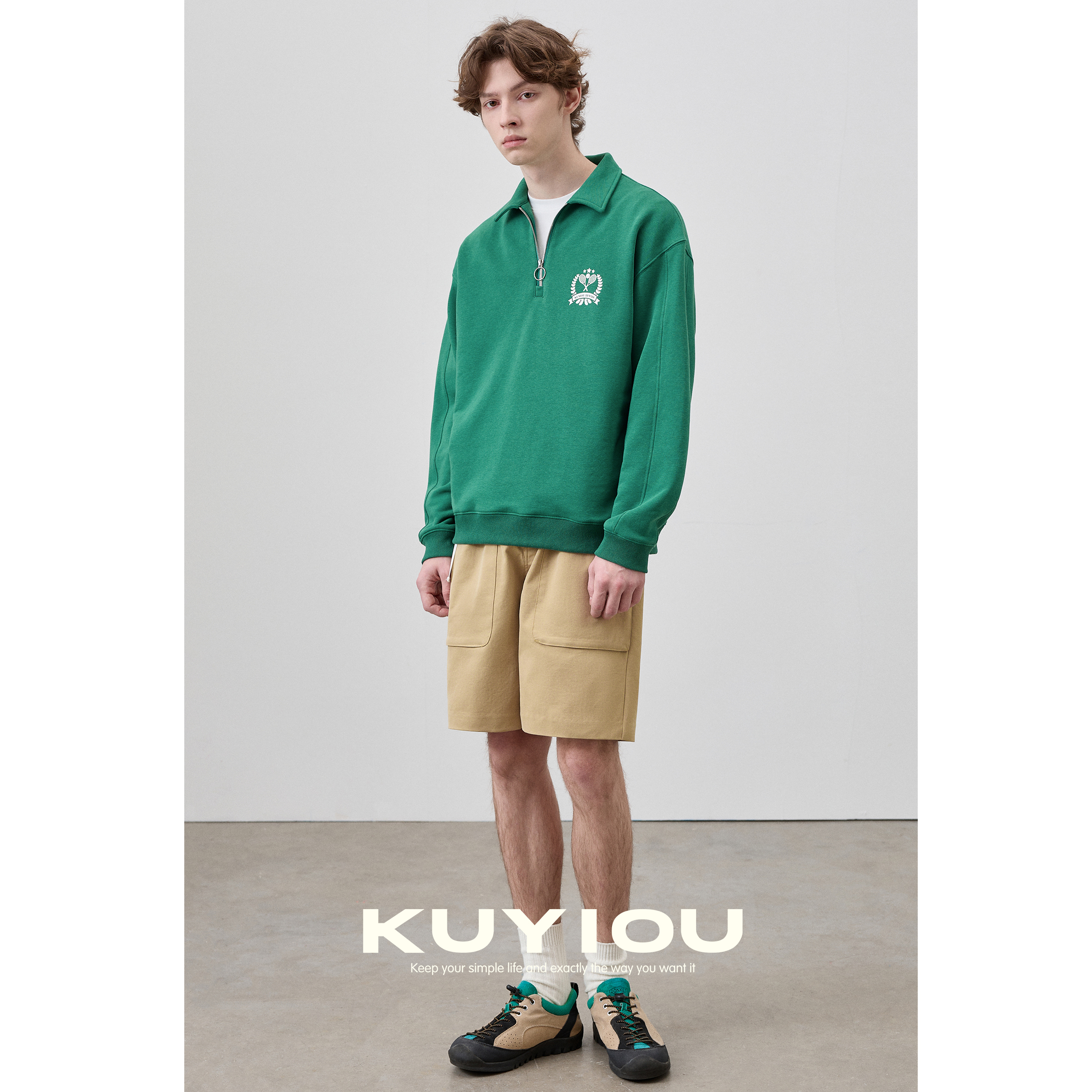 KUYIOU/网球印花 重磅毛圈棉落肩袖宽松半开襟拉链POLO翻领卫衣男