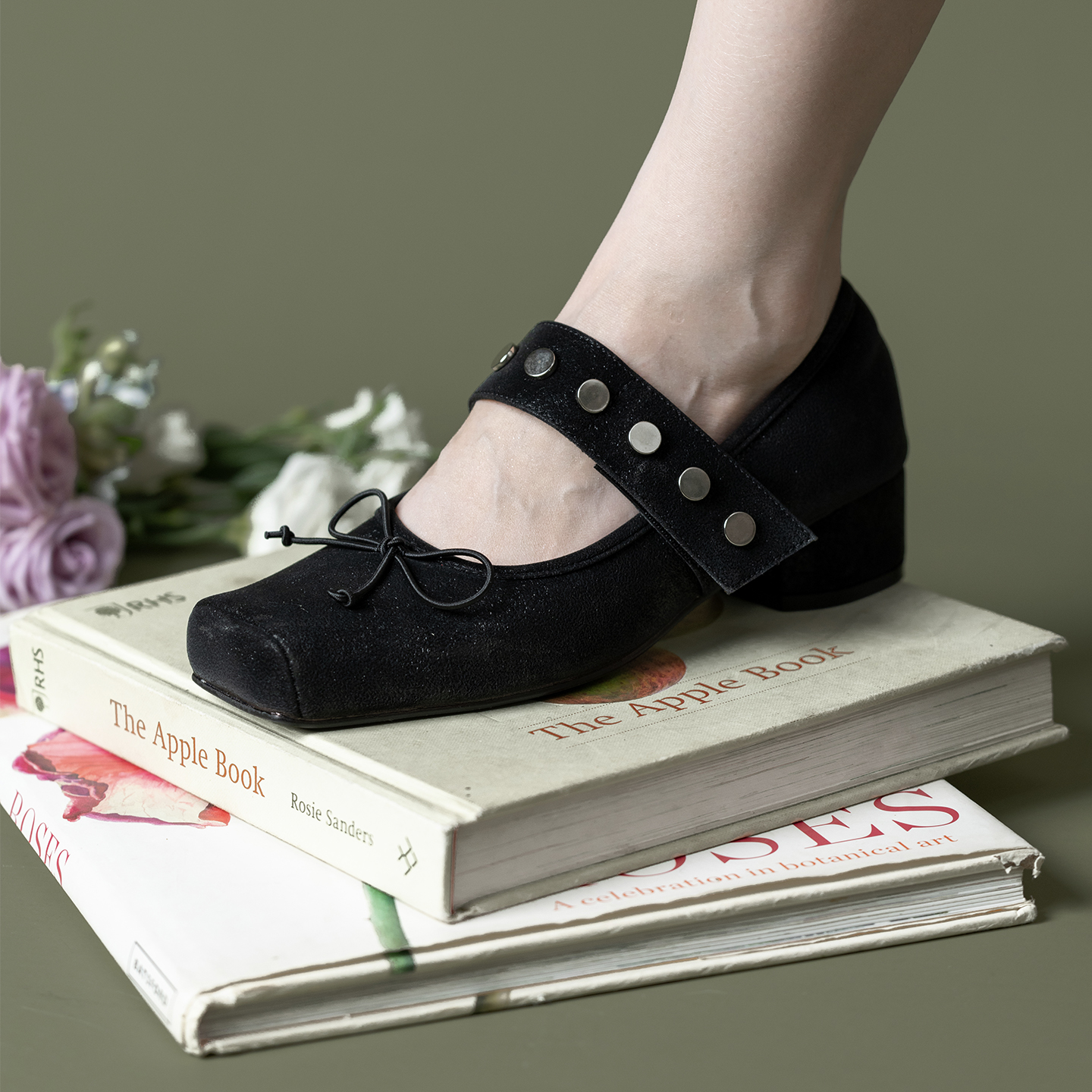 蝴蝶结一字带方头粗跟芭蕾舞鞋