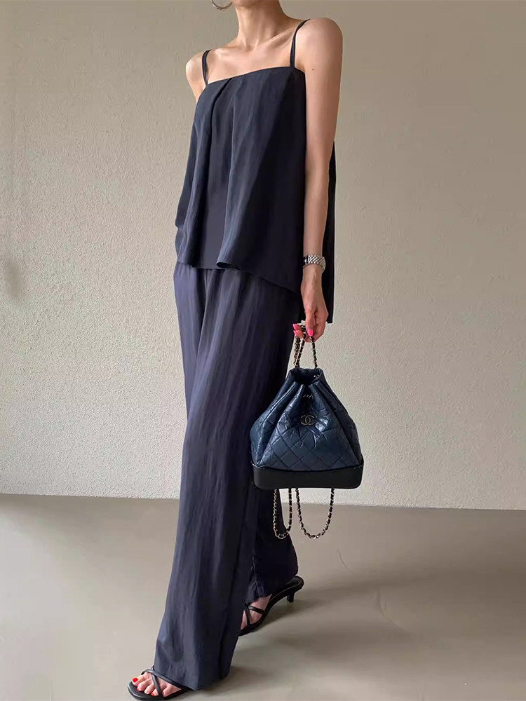 韩国chic夏季复古气质方领压褶百搭吊带背心+高腰阔腿裤长裤套装