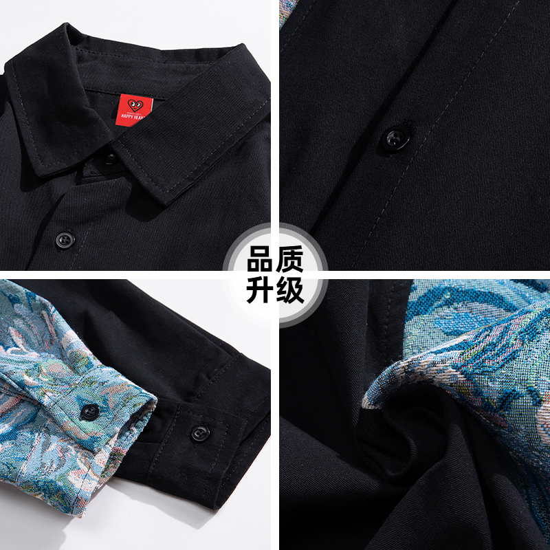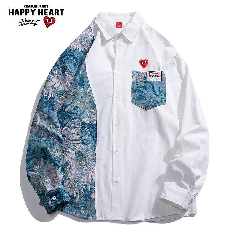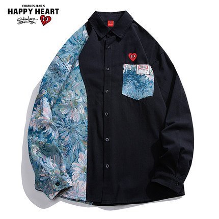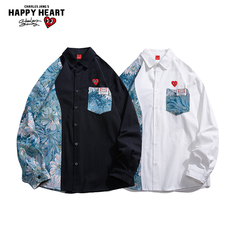 查尔斯桃心 国风水墨花卉拼接长袖衬衫男春季新款单排扣夹克外套