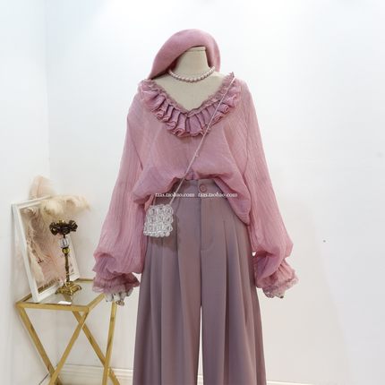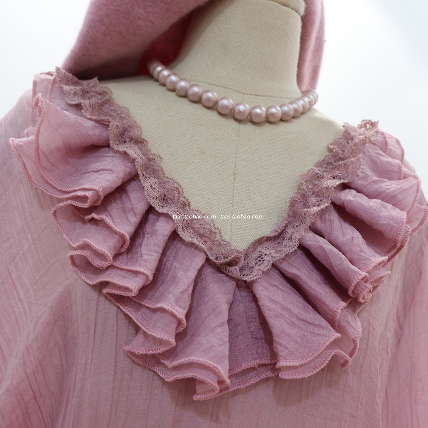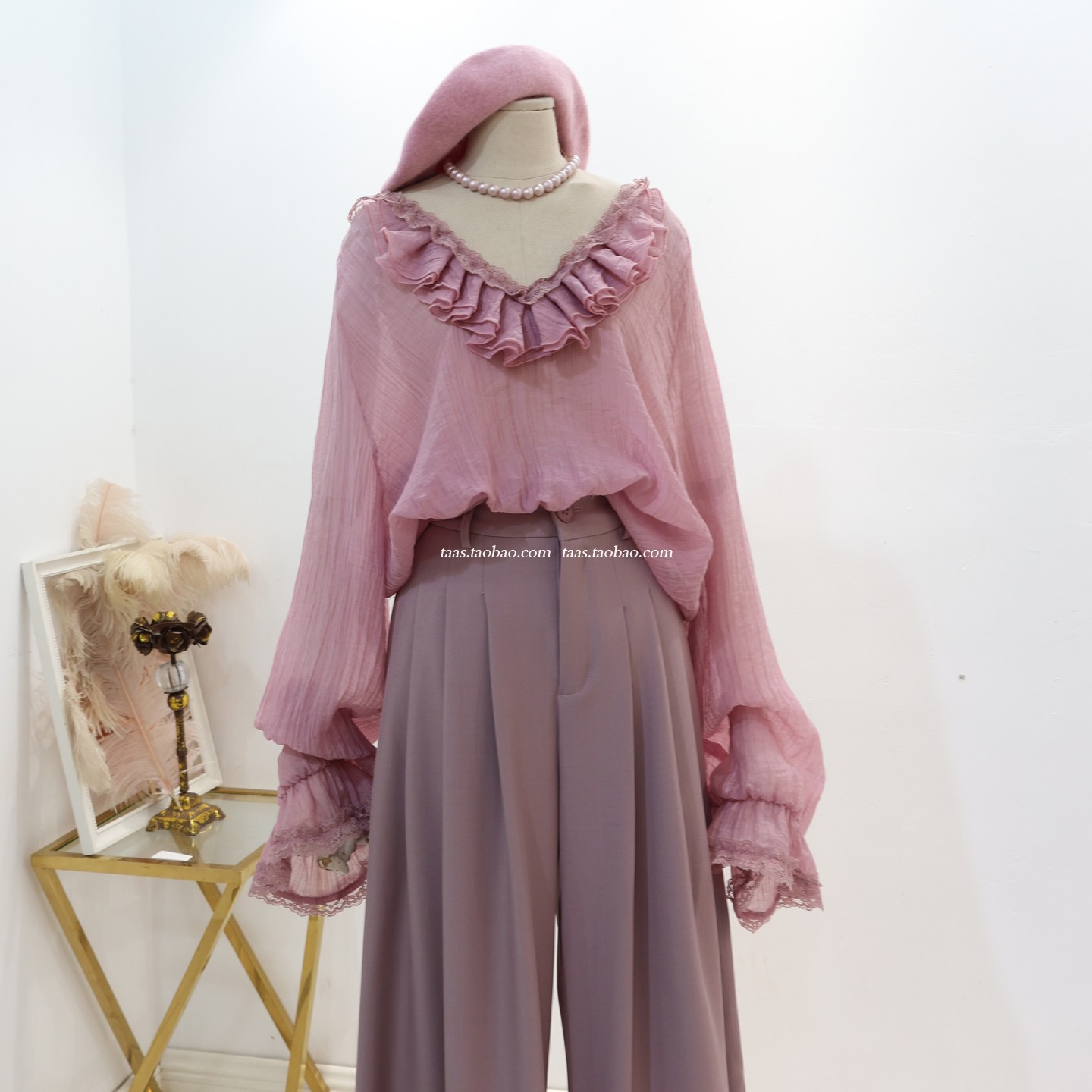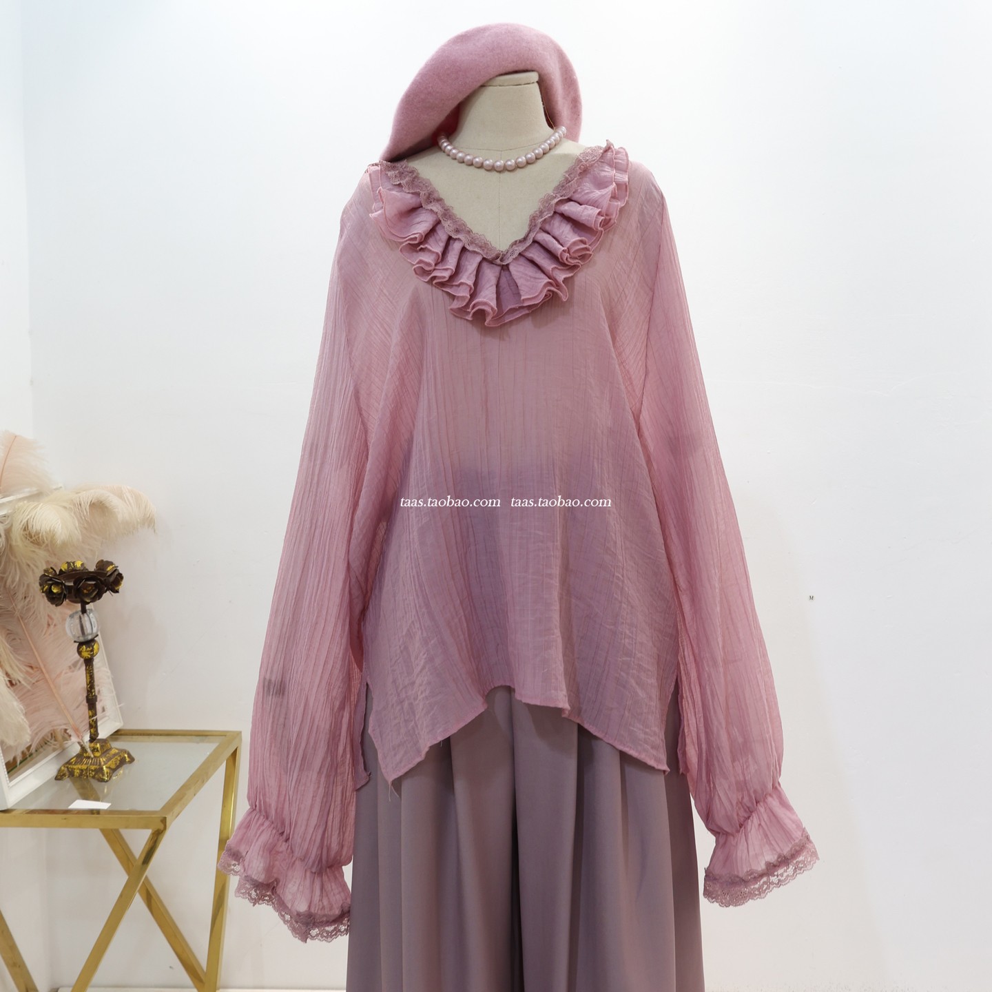 粉色荷叶边蕾丝拼接宽松娃娃衫2025秋季法式少风压逸大件衬衫上衣