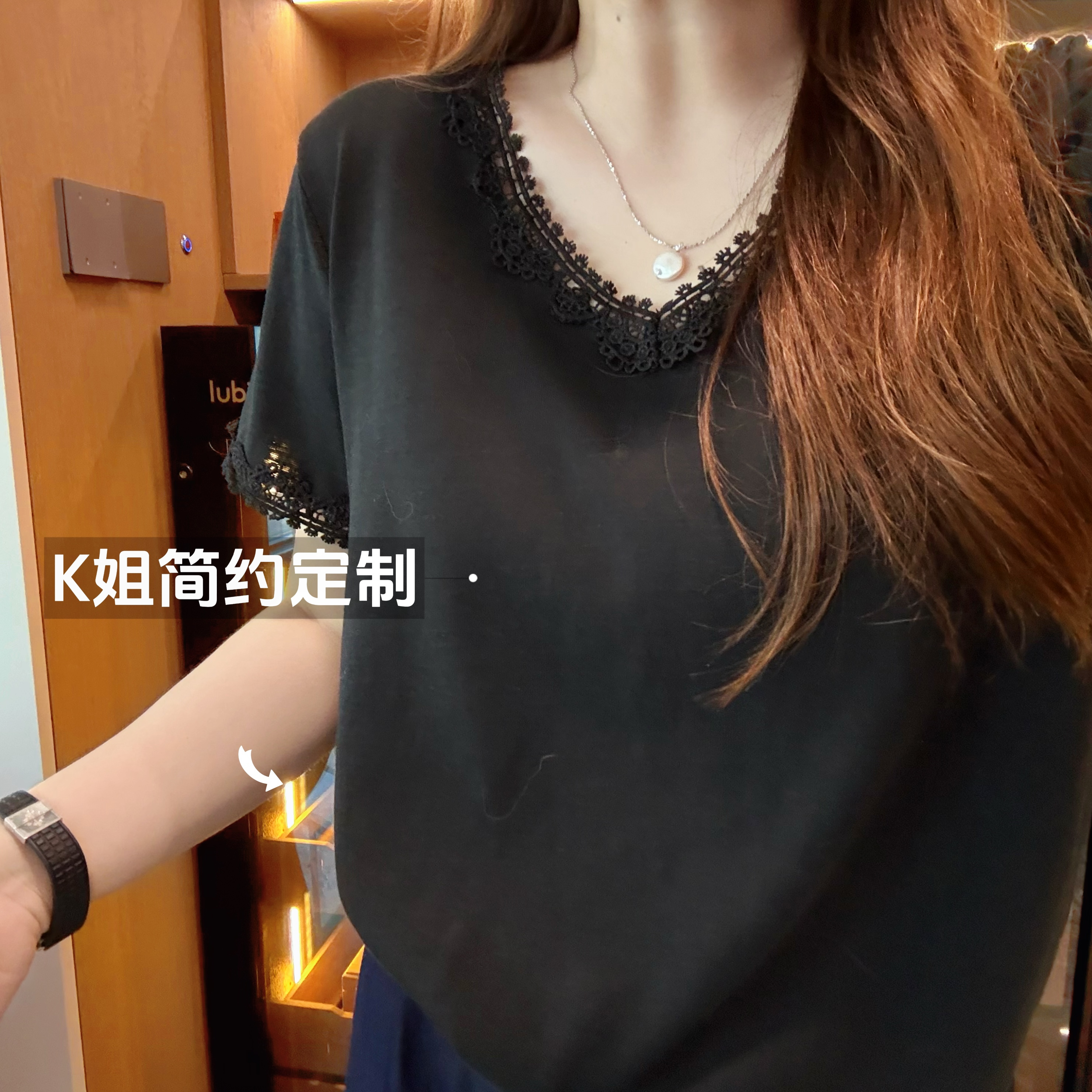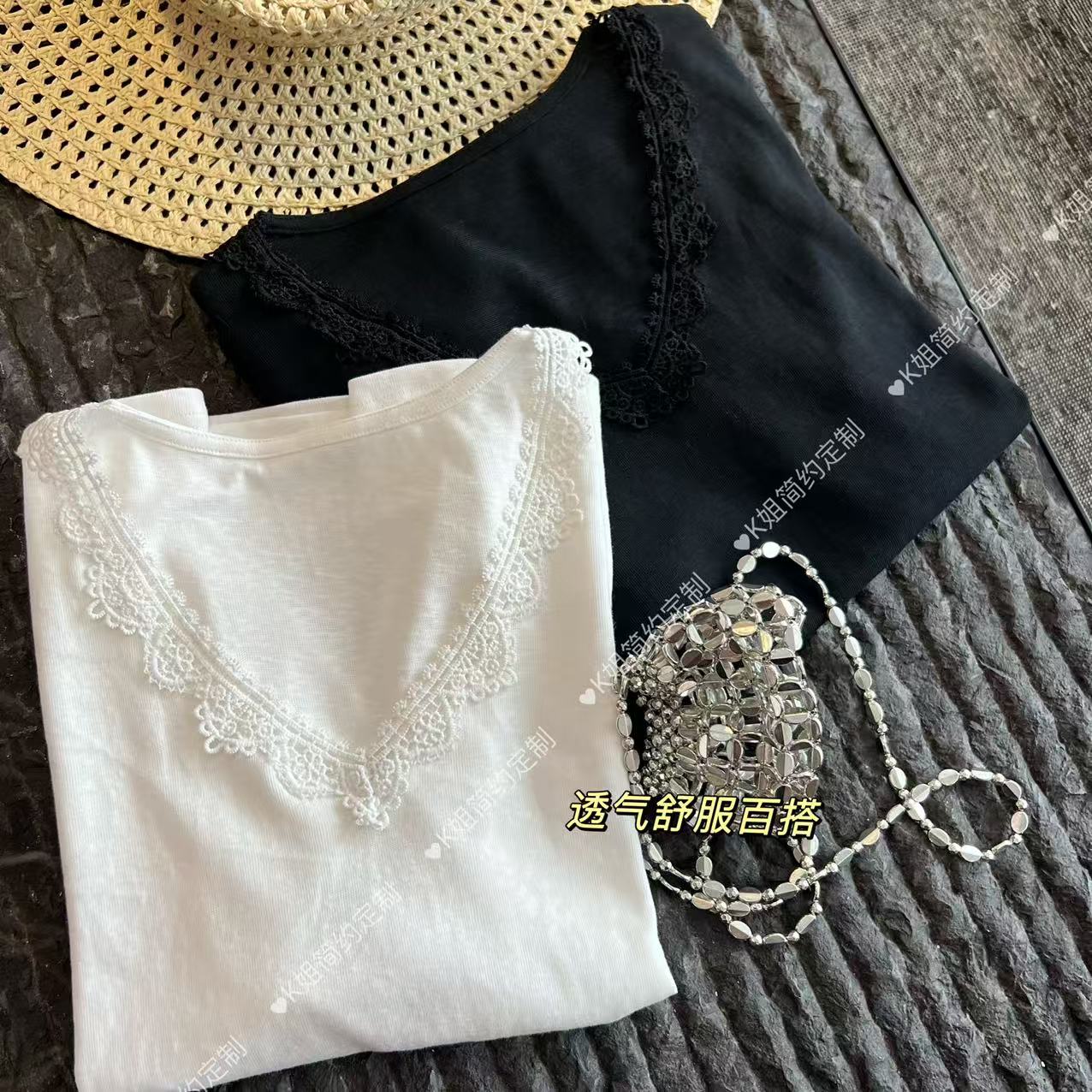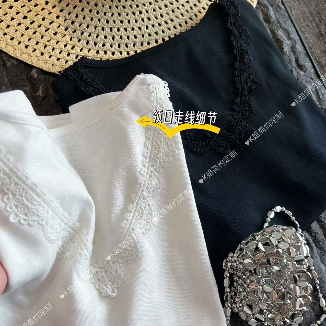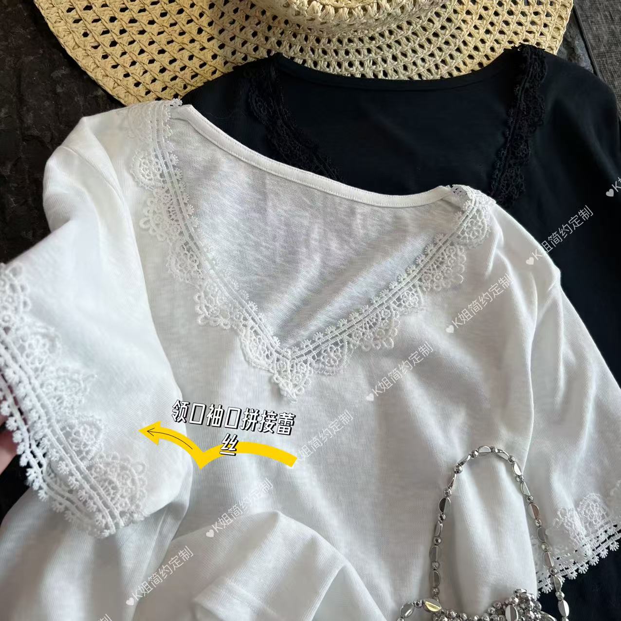 2025新款蕾丝花边拼接短袖T恤女夏季薄款宽松显瘦休闲百搭V领上衣