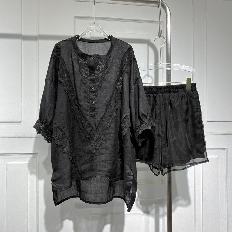 中长款圆领拼接蕾丝短袖麻质衬衫