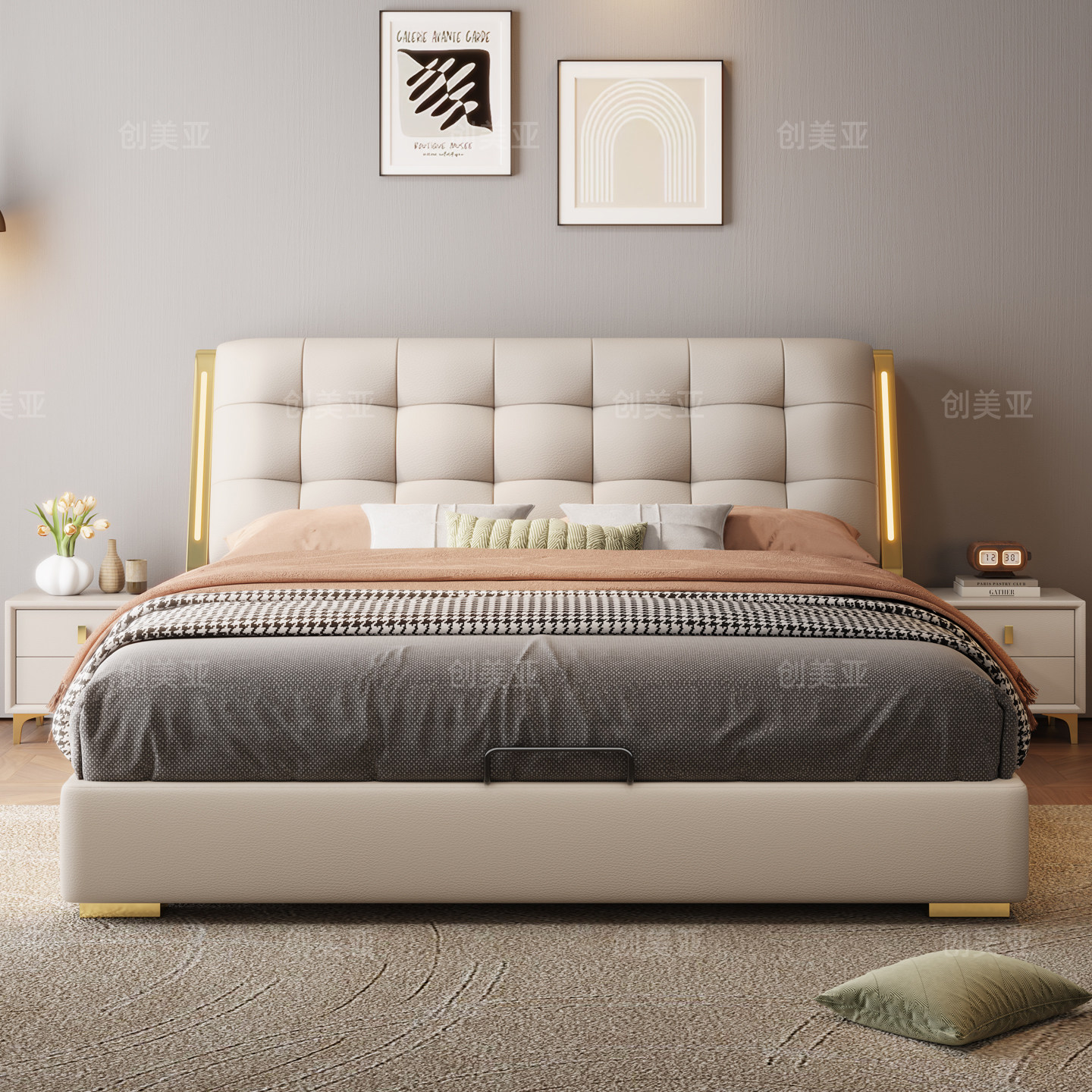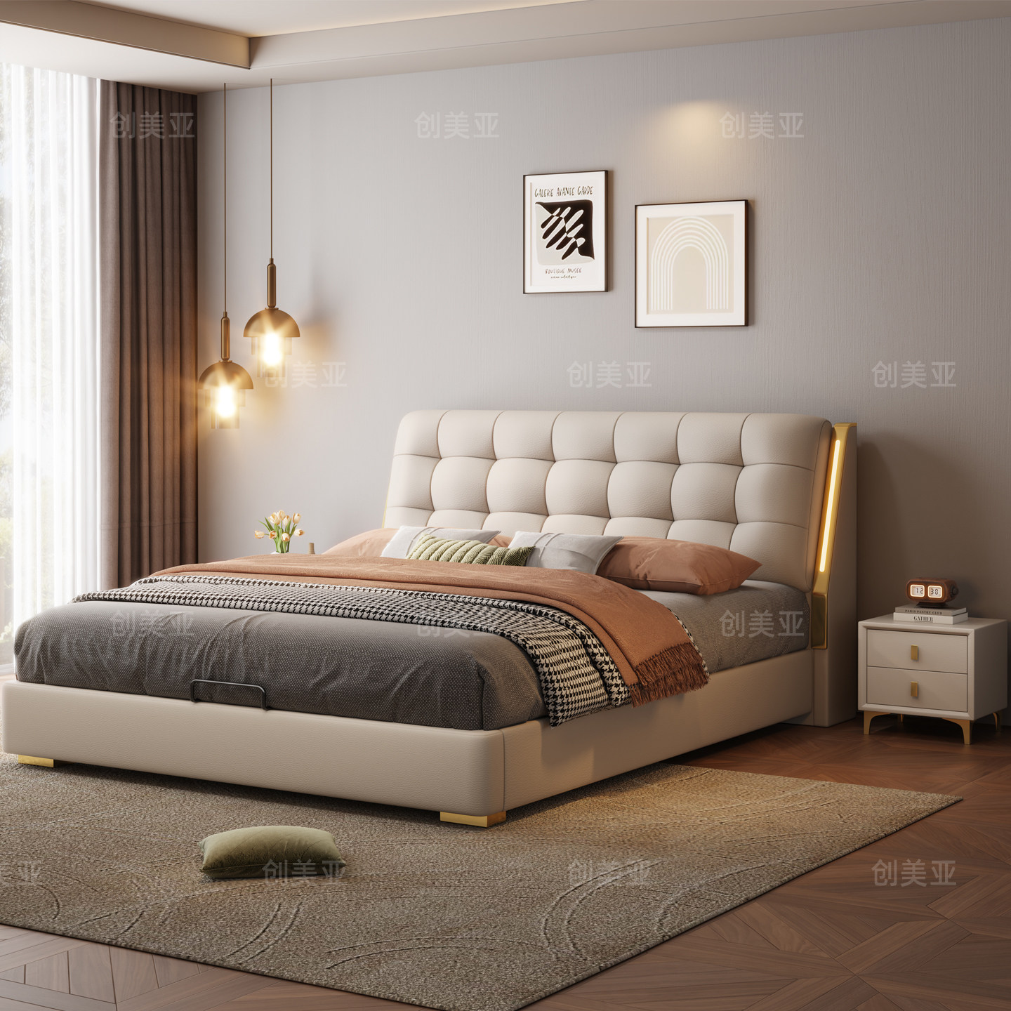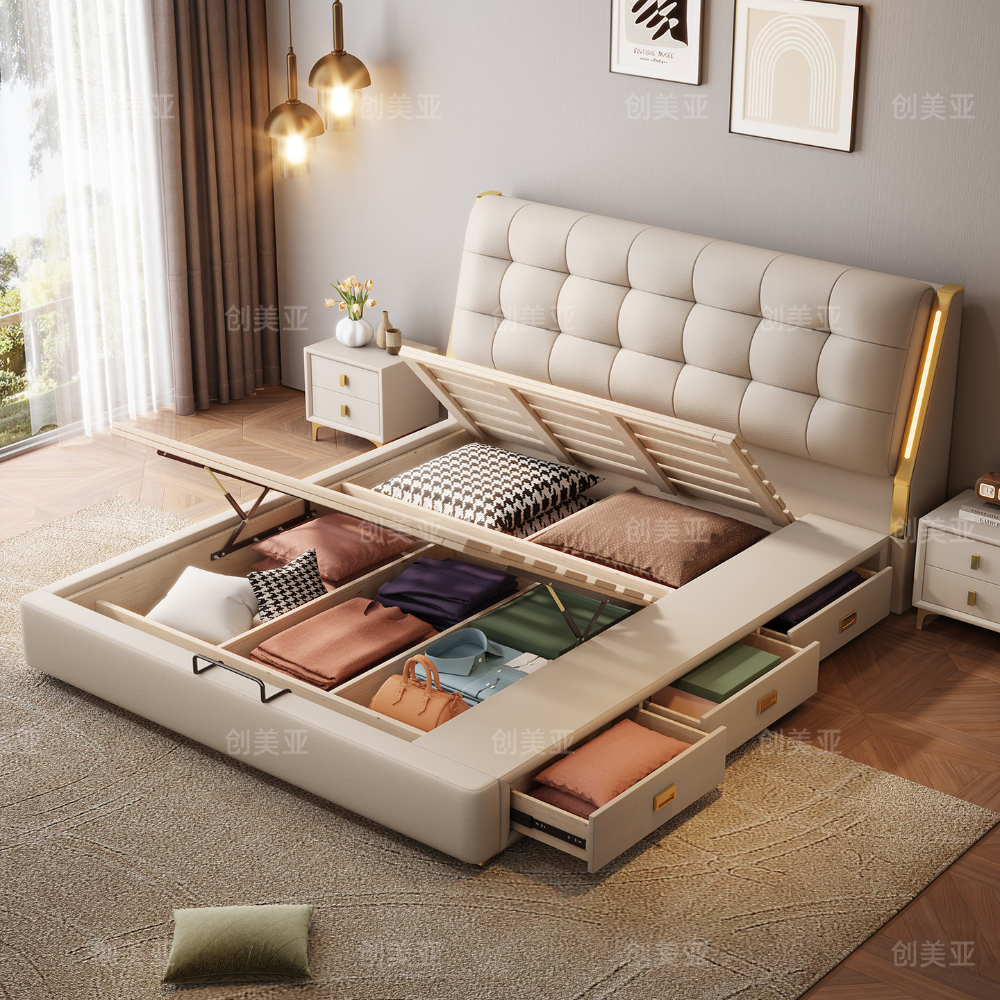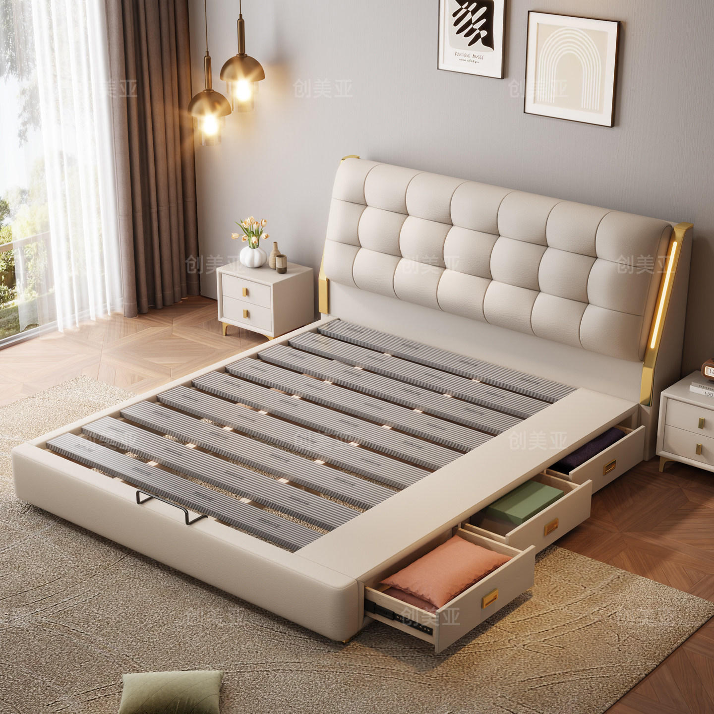 轻奢真皮床主卧双人床现代简约2米x2米2大床抽屉高箱储物软包床