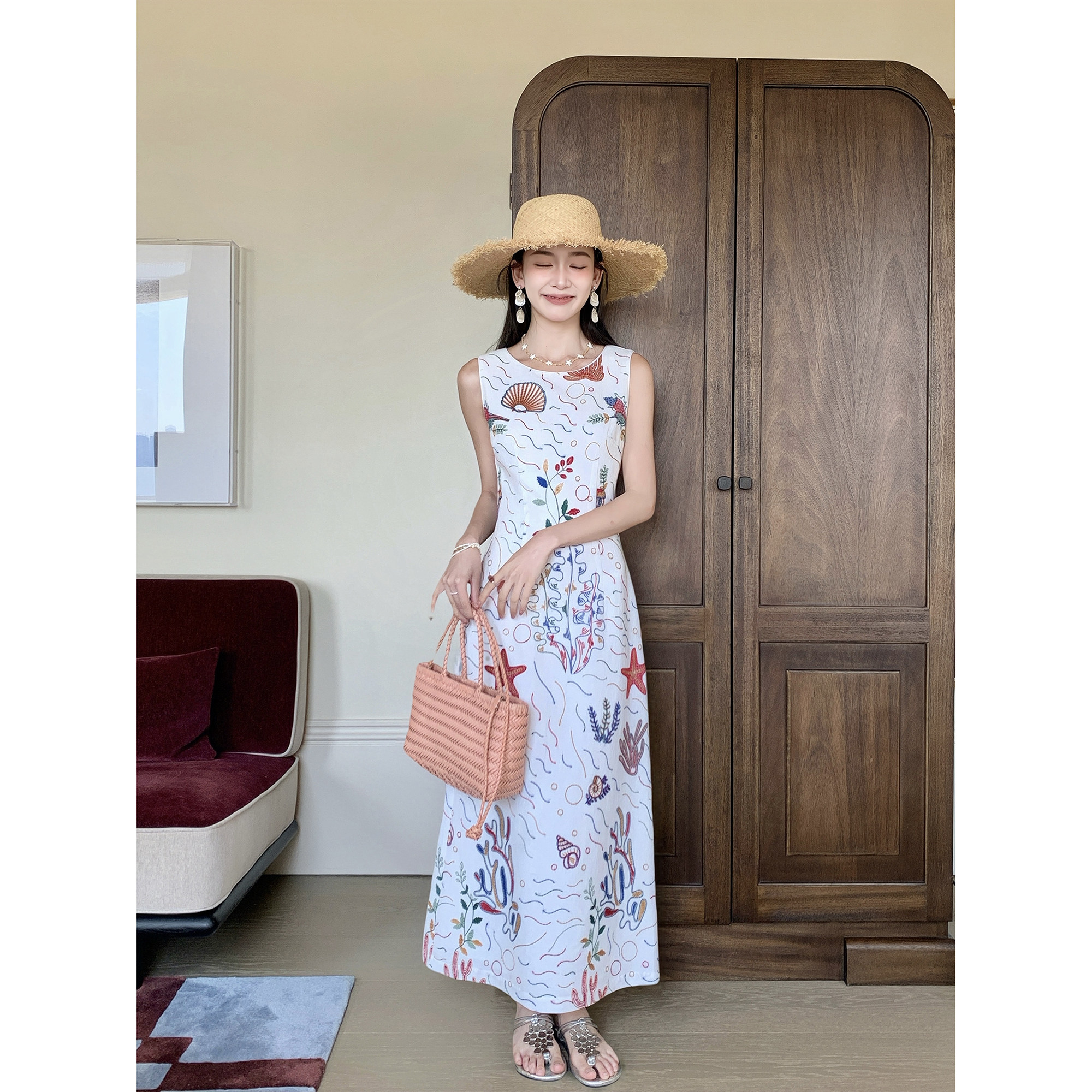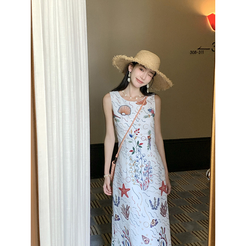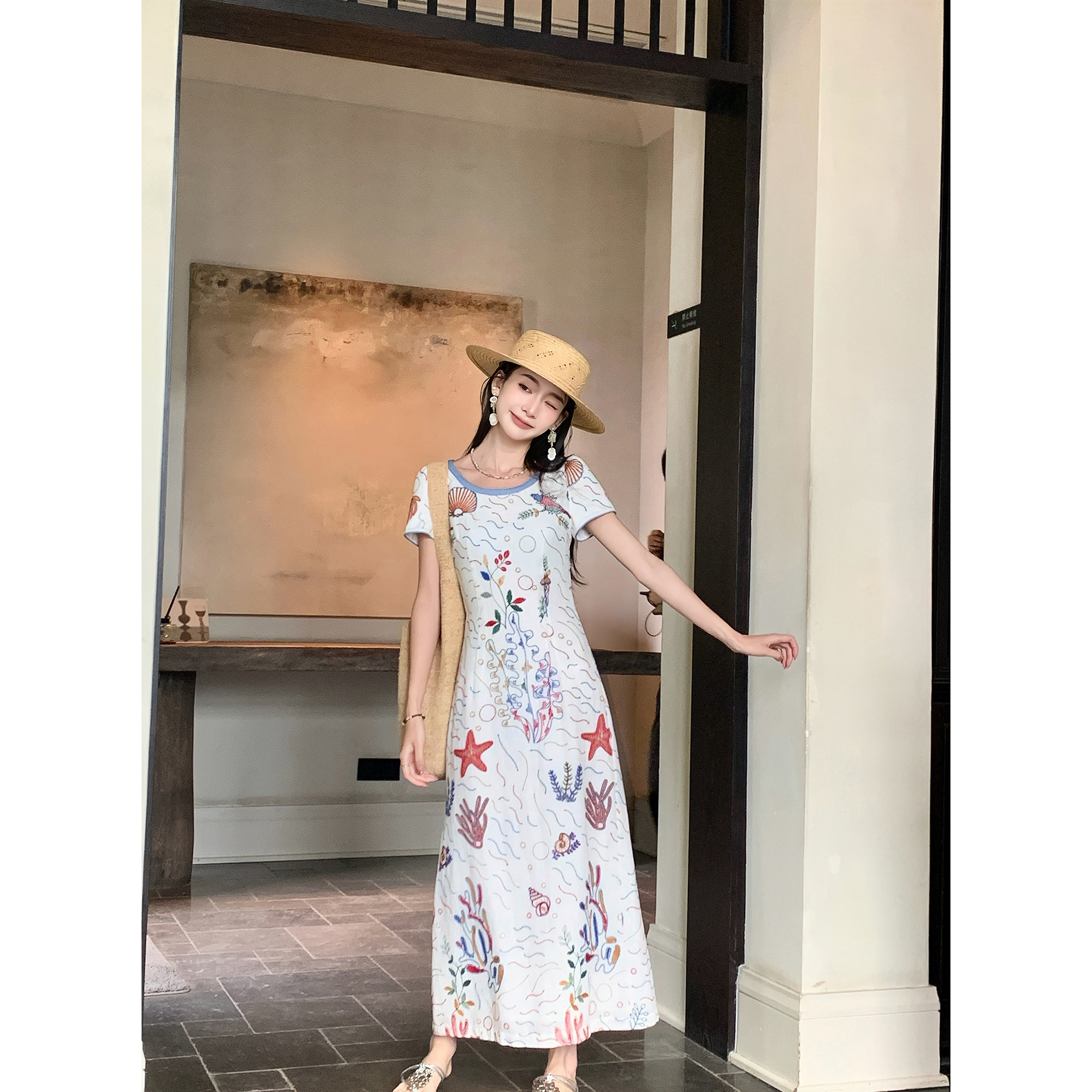 Thecoco 海星贝壳 勾线刺绣棉连衣裙女夏季重工收腰显瘦气质裙子