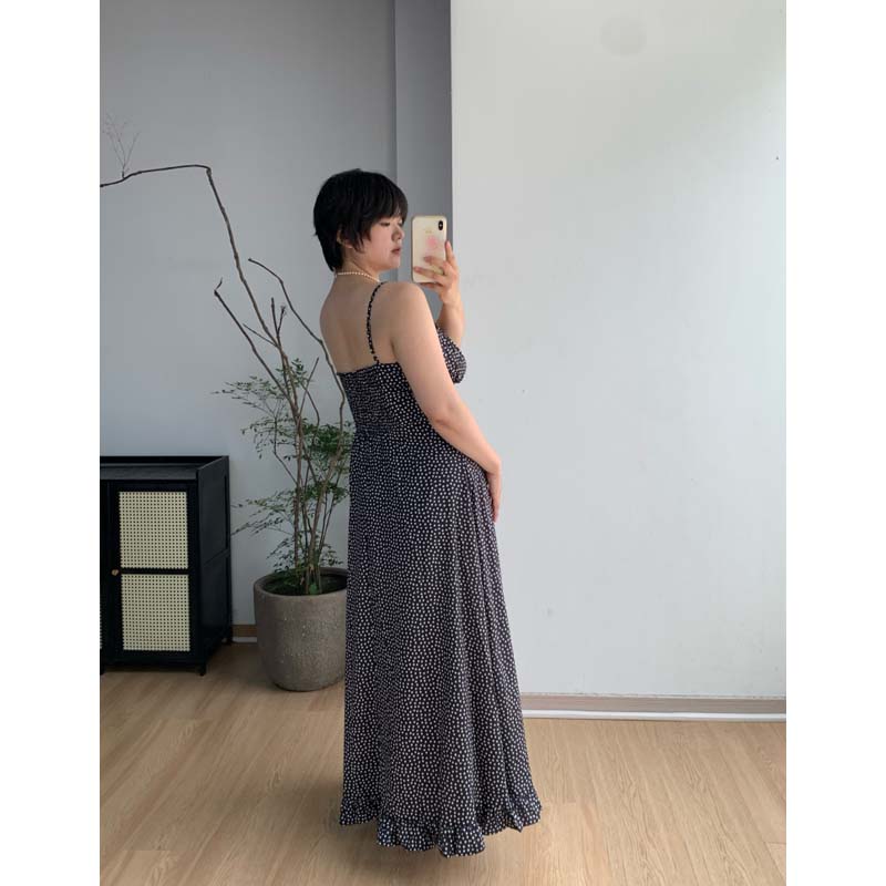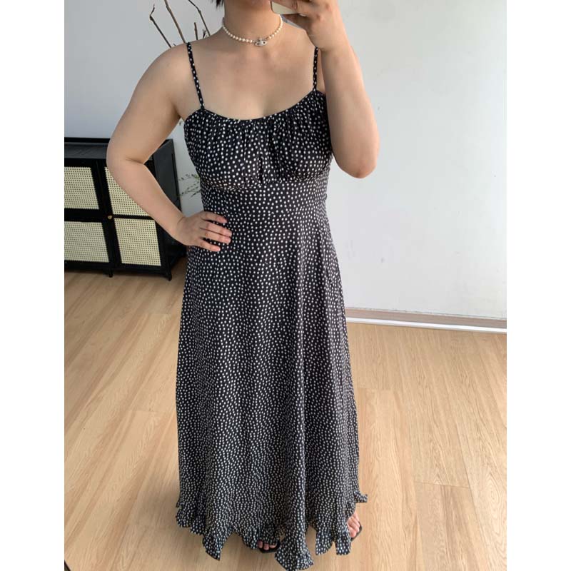 【清仓特价8折】微胖荷叶边波点收腰吊带连衣裙细肩带修身长裙女