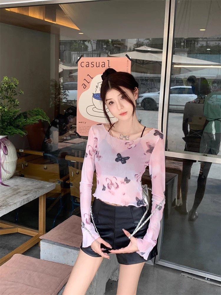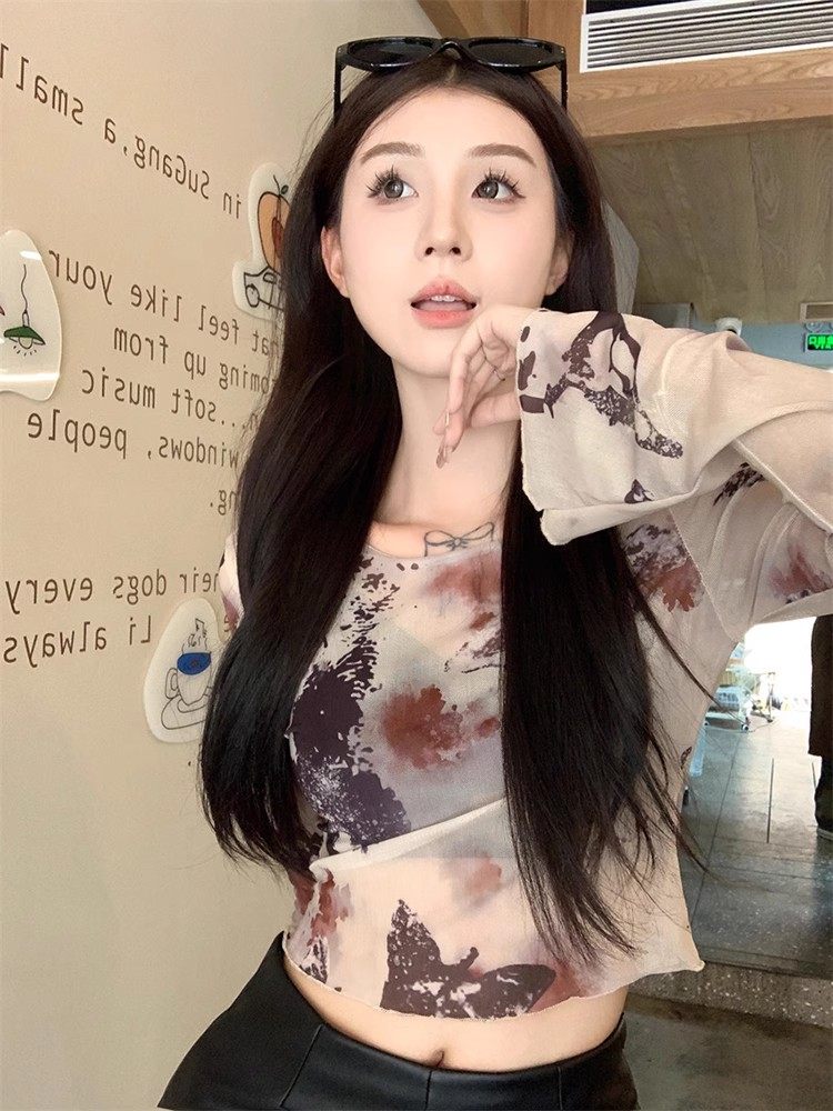 美式复古微透扎染长袖T恤女夏辣妹薄纱防晒罩衫修身短款别致上衣