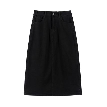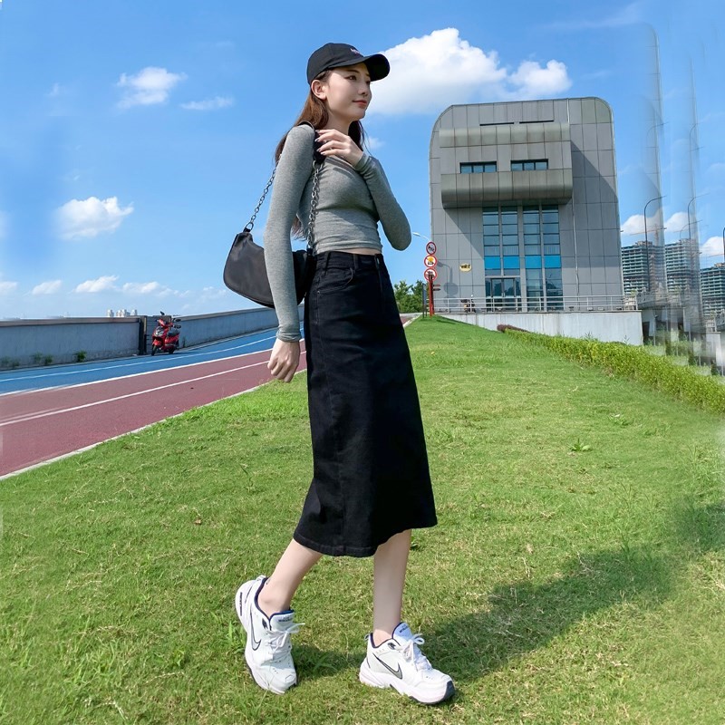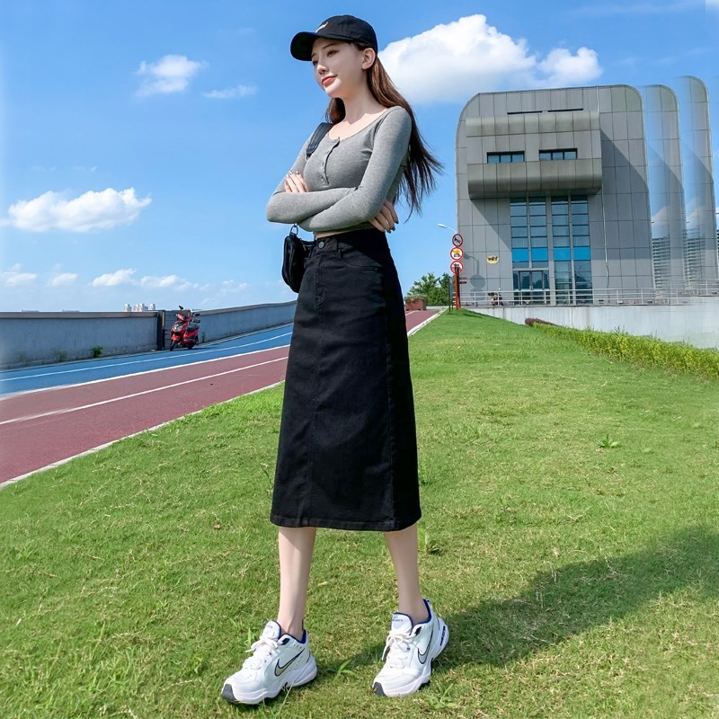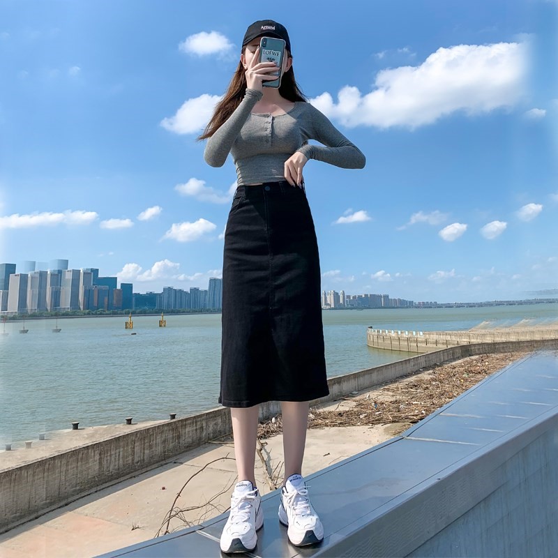 黑色牛仔裙半身裙女春秋中长款后开叉高腰显瘦弹力a字包臀长裙子