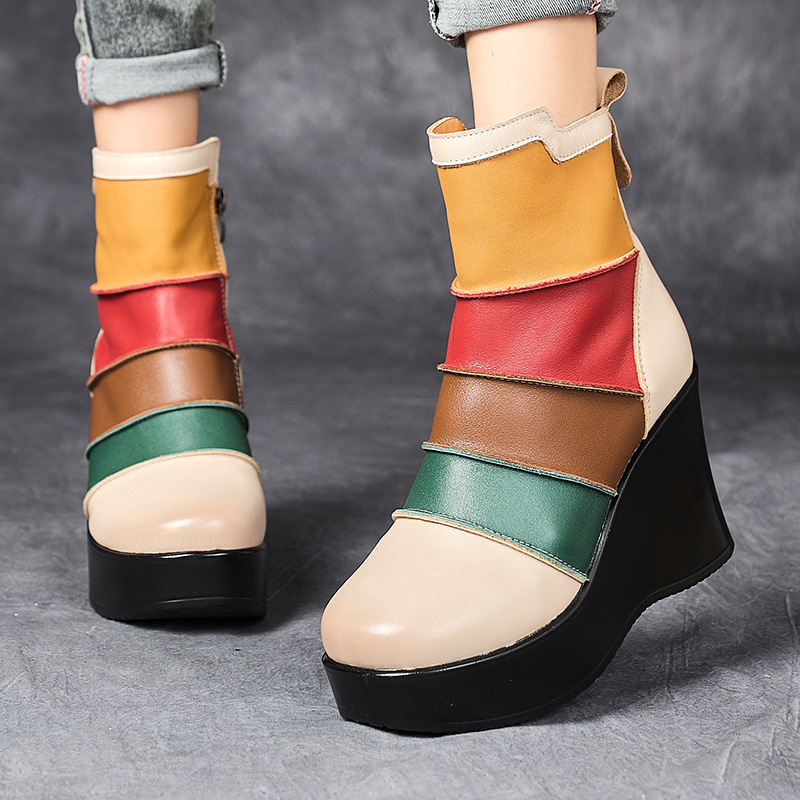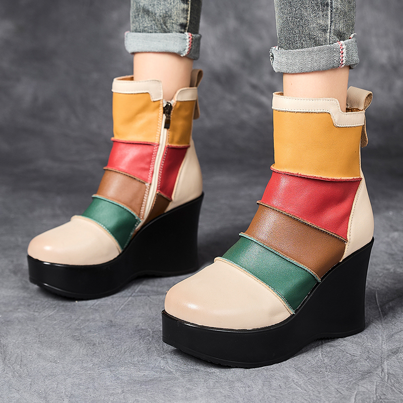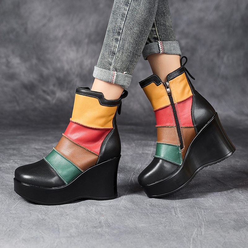 嫔妃真皮女单靴子坡跟厚底马丁靴时尚休闲彩虹短靴加绒棉靴裸靴