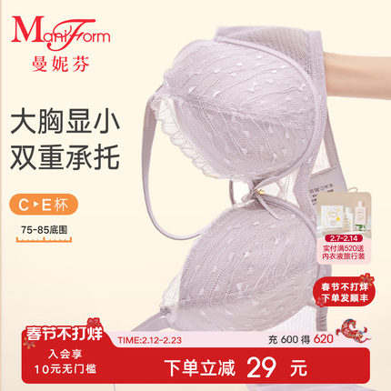 曼妮芬大胸显小文胸轻薄性感蕾丝软钢圈内衣女舒适美背大杯文胸罩