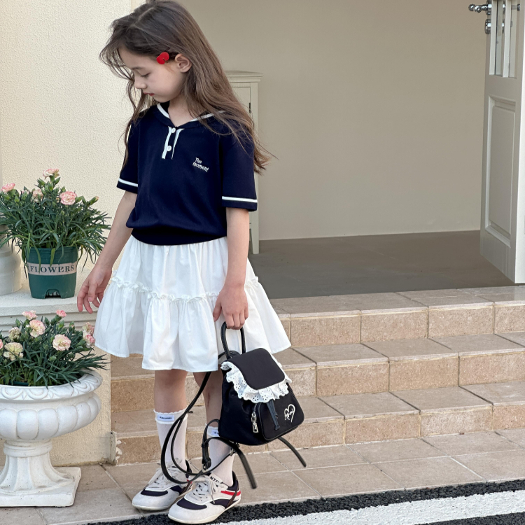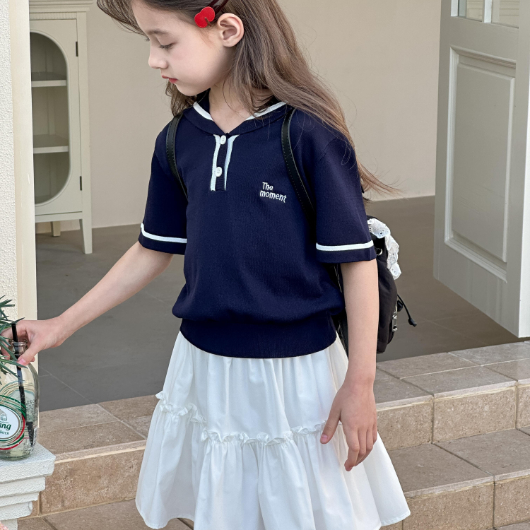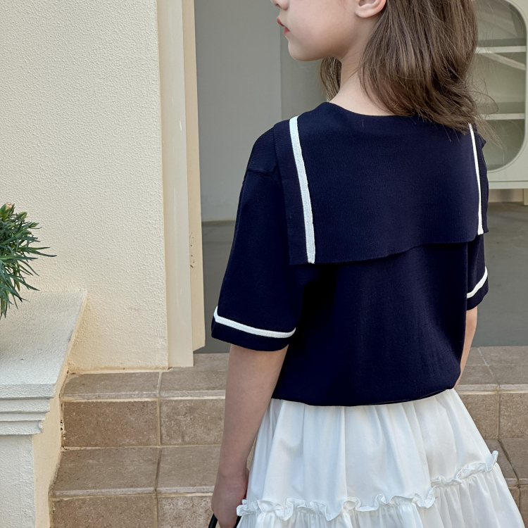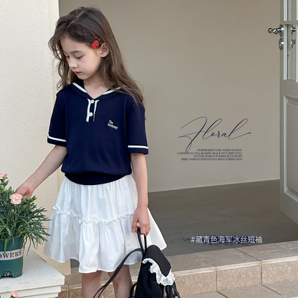 女童T恤2025夏季新款儿童海军风冰丝针织短袖撞色百搭套头上衣潮
