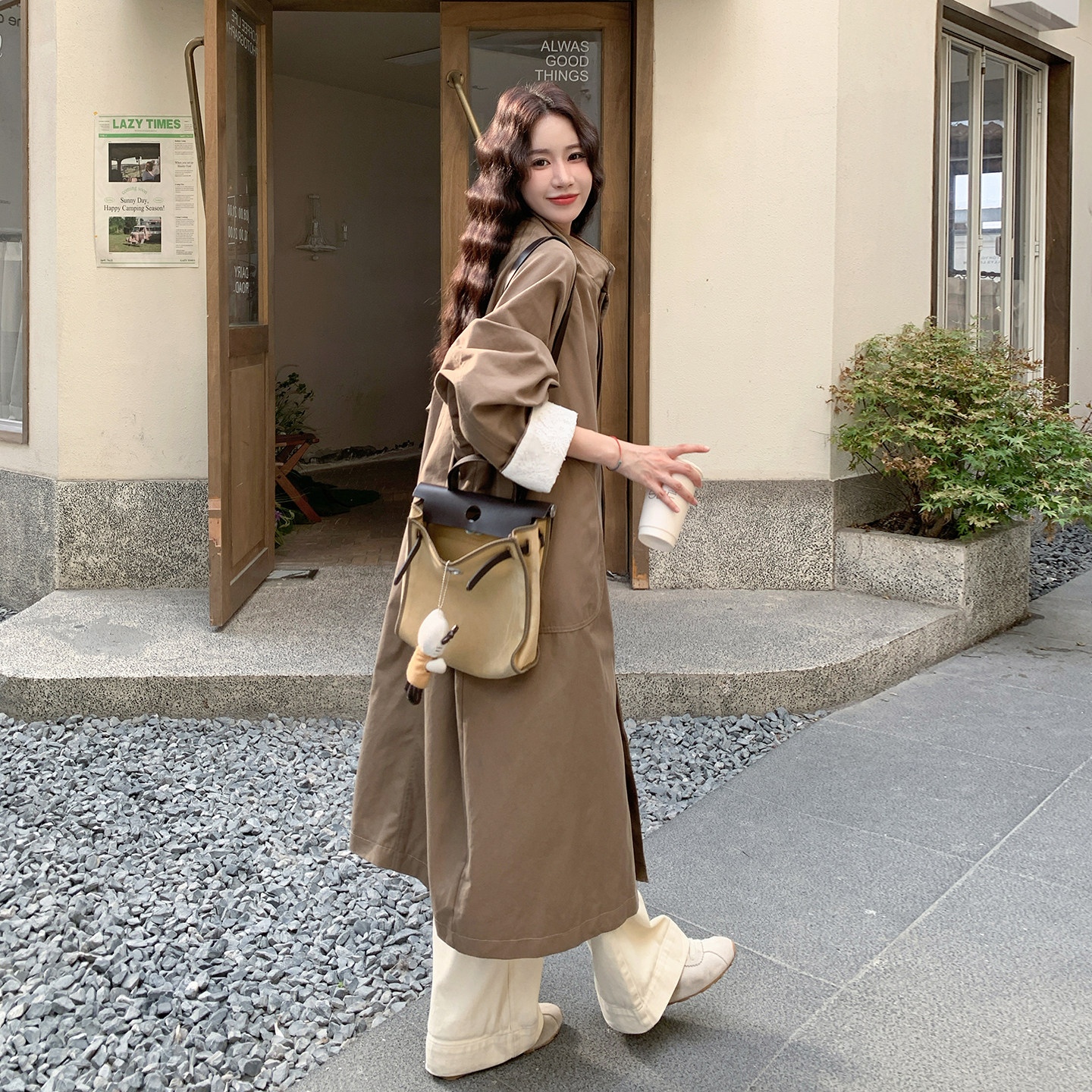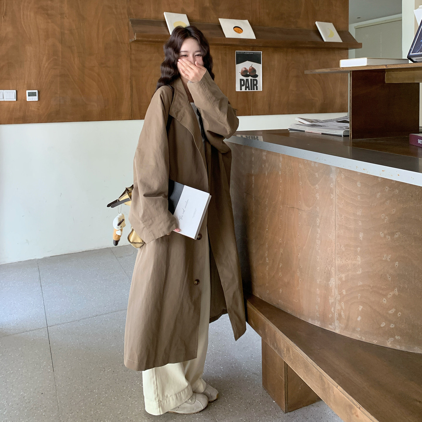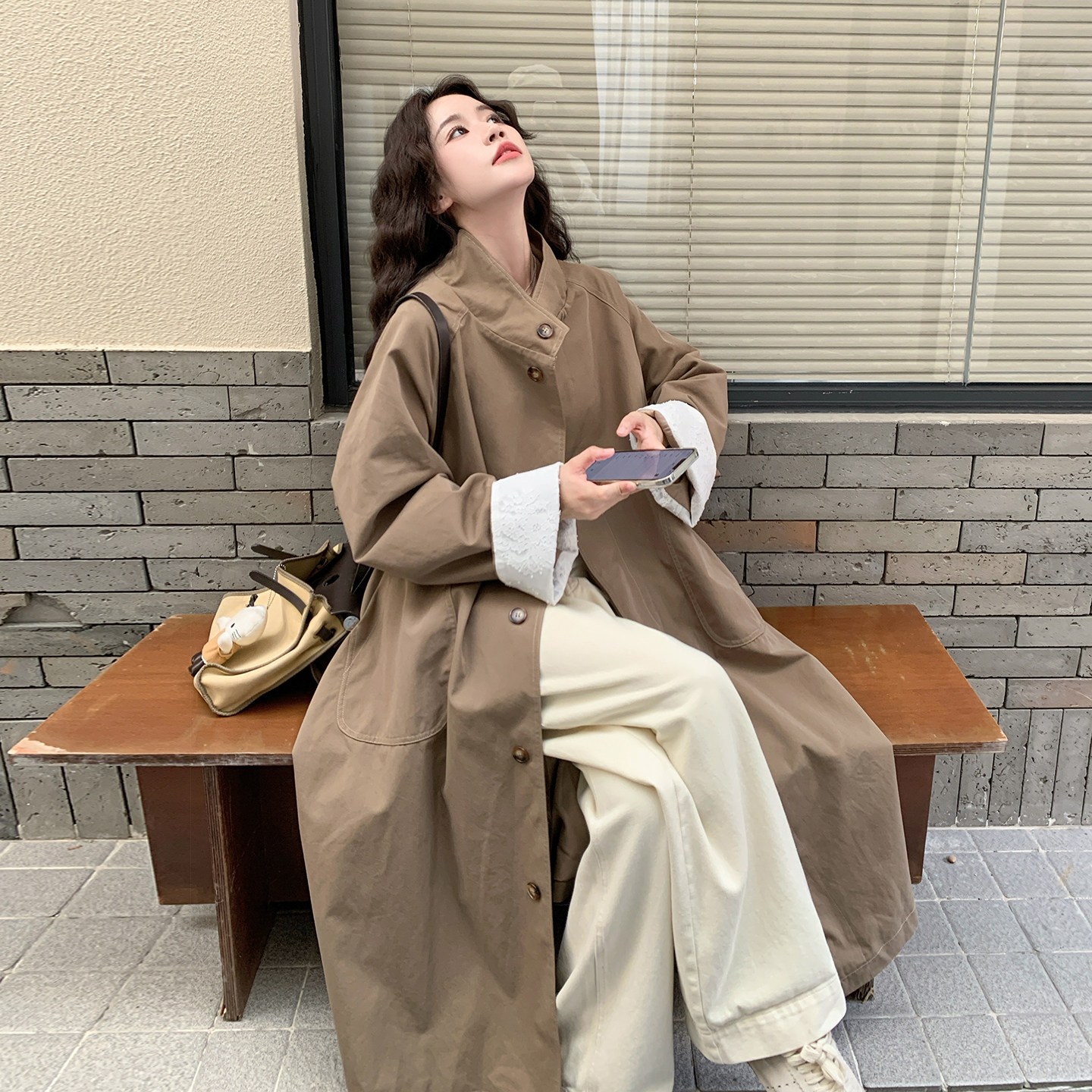 卡其色宽松英伦风长款风衣外套女2026年春季新款蕾丝拼接百搭大衣