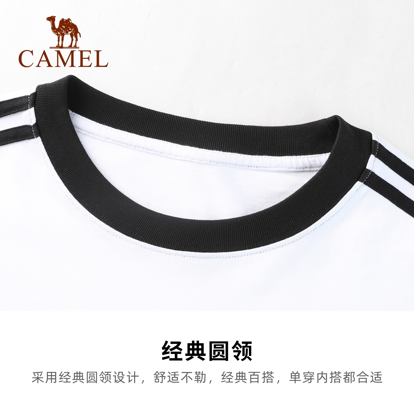 骆驼运动圆领长袖T恤男女同款秋季新款休闲卫衣三条杠黑白色上衣