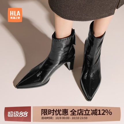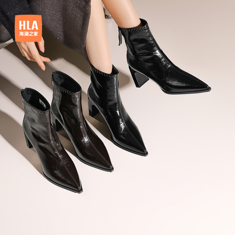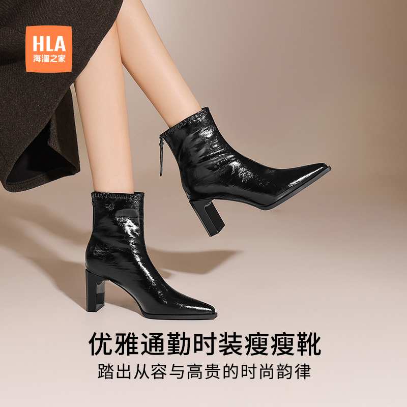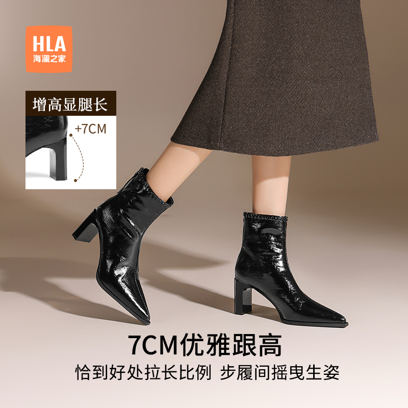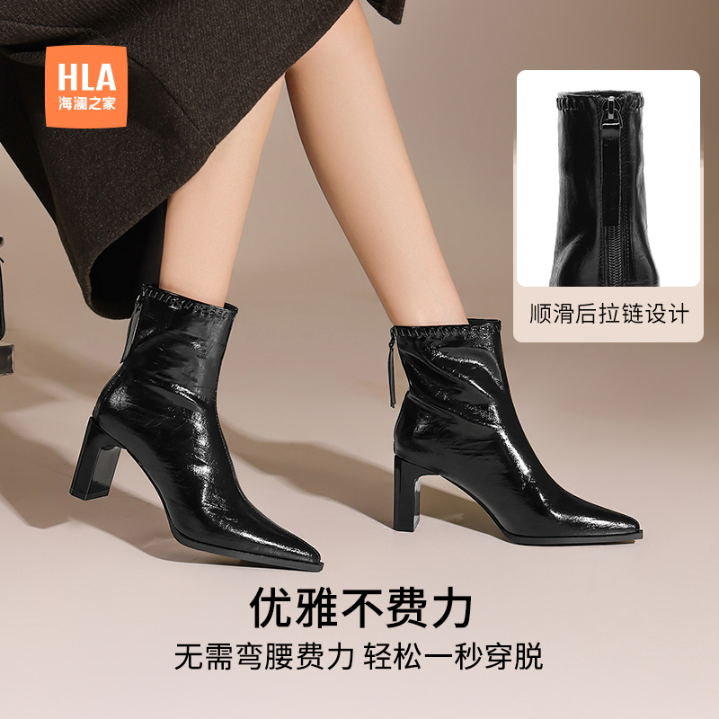 HLA/海澜之家高跟短靴女2025新款冬季粗跟尖头弹力瘦瘦靴加绒女靴