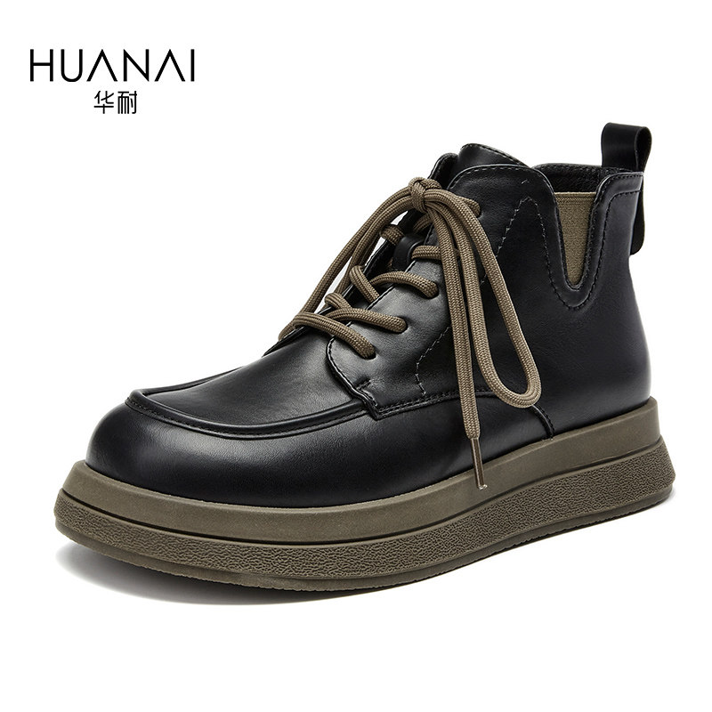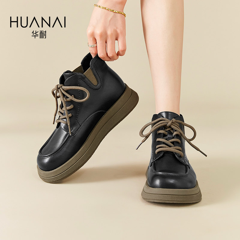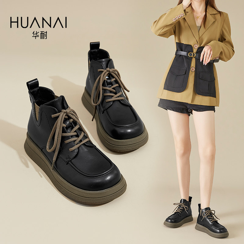 华耐厚底加绒马丁靴女2025秋冬新款英伦风短靴低帮黑色平底小皮鞋