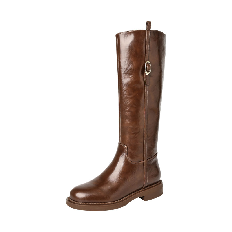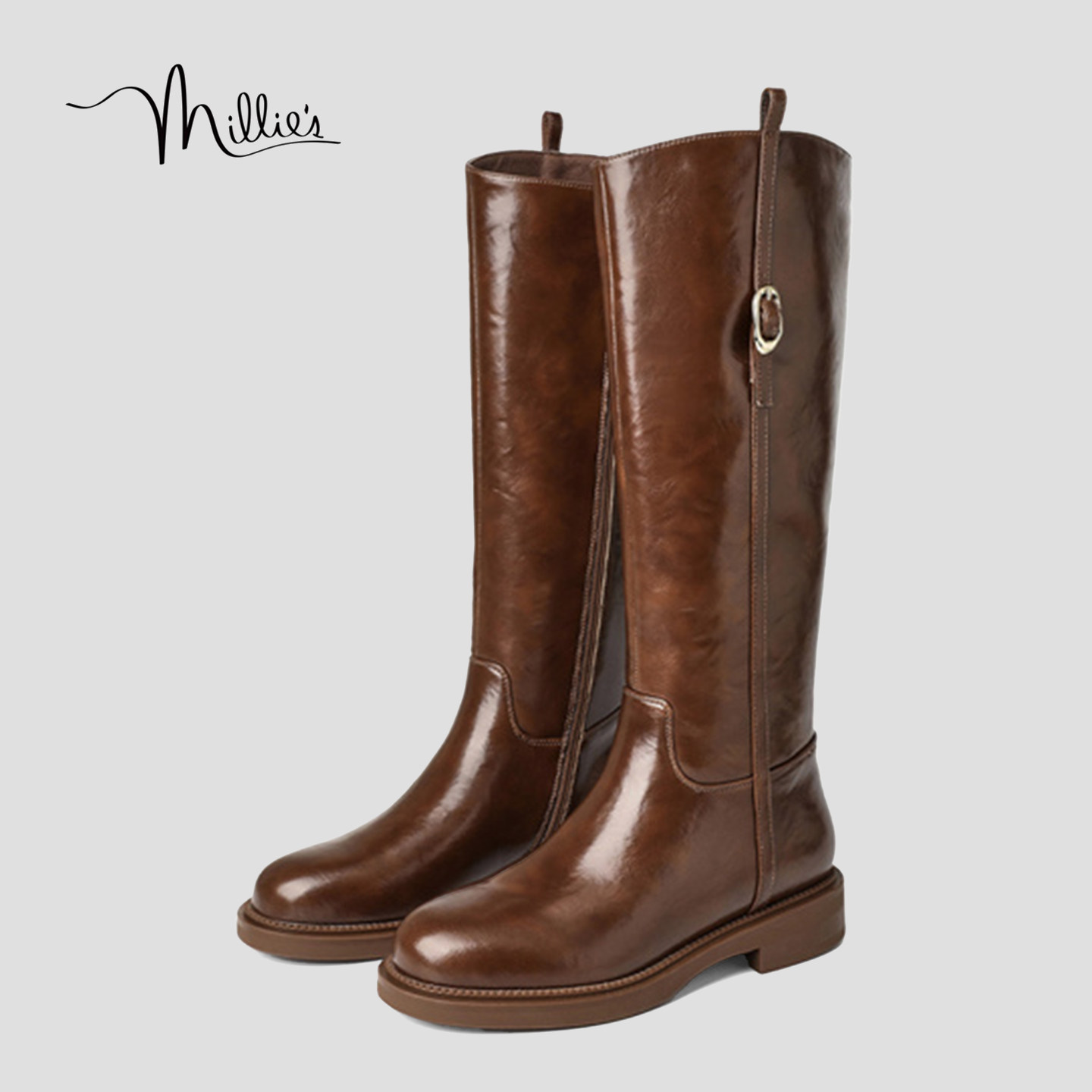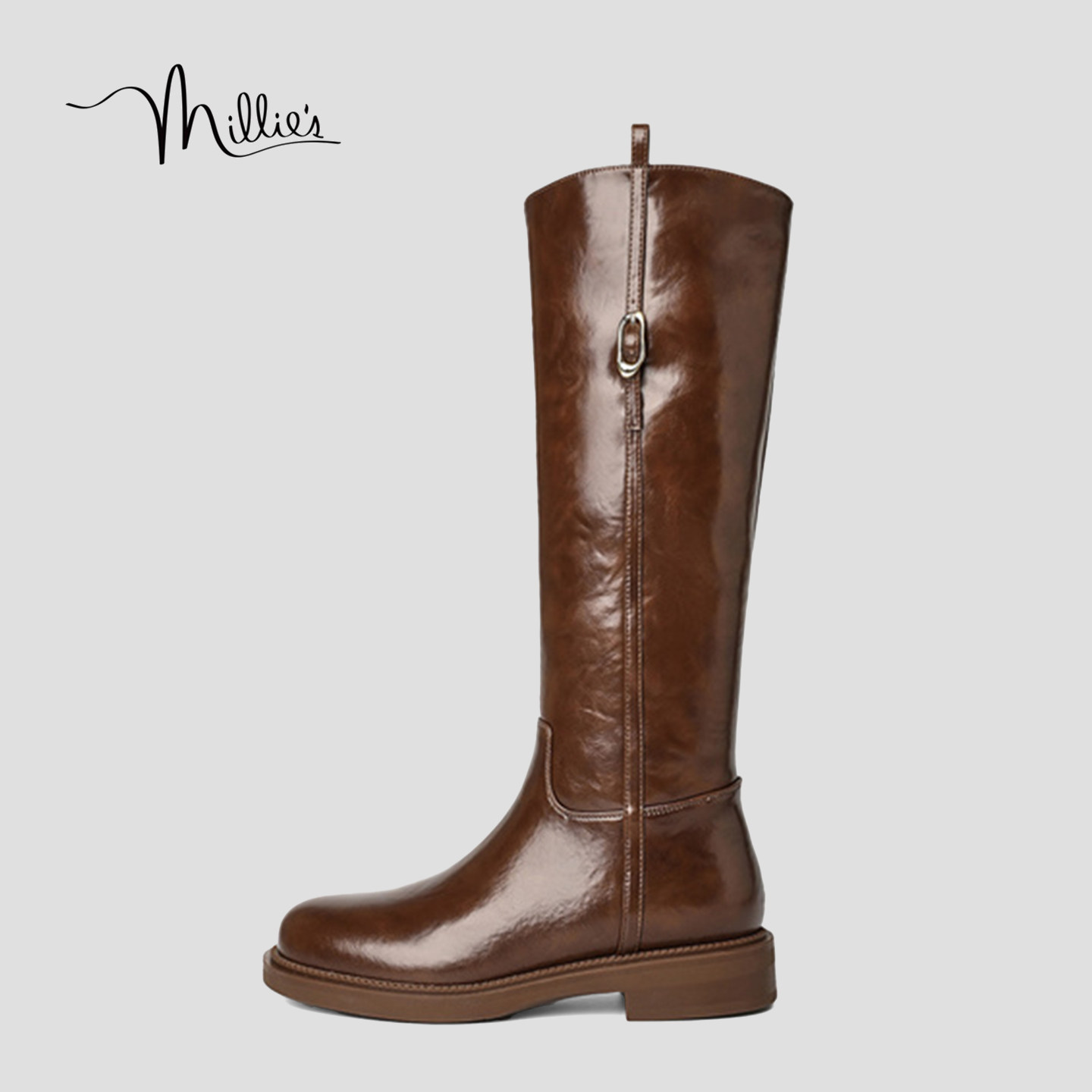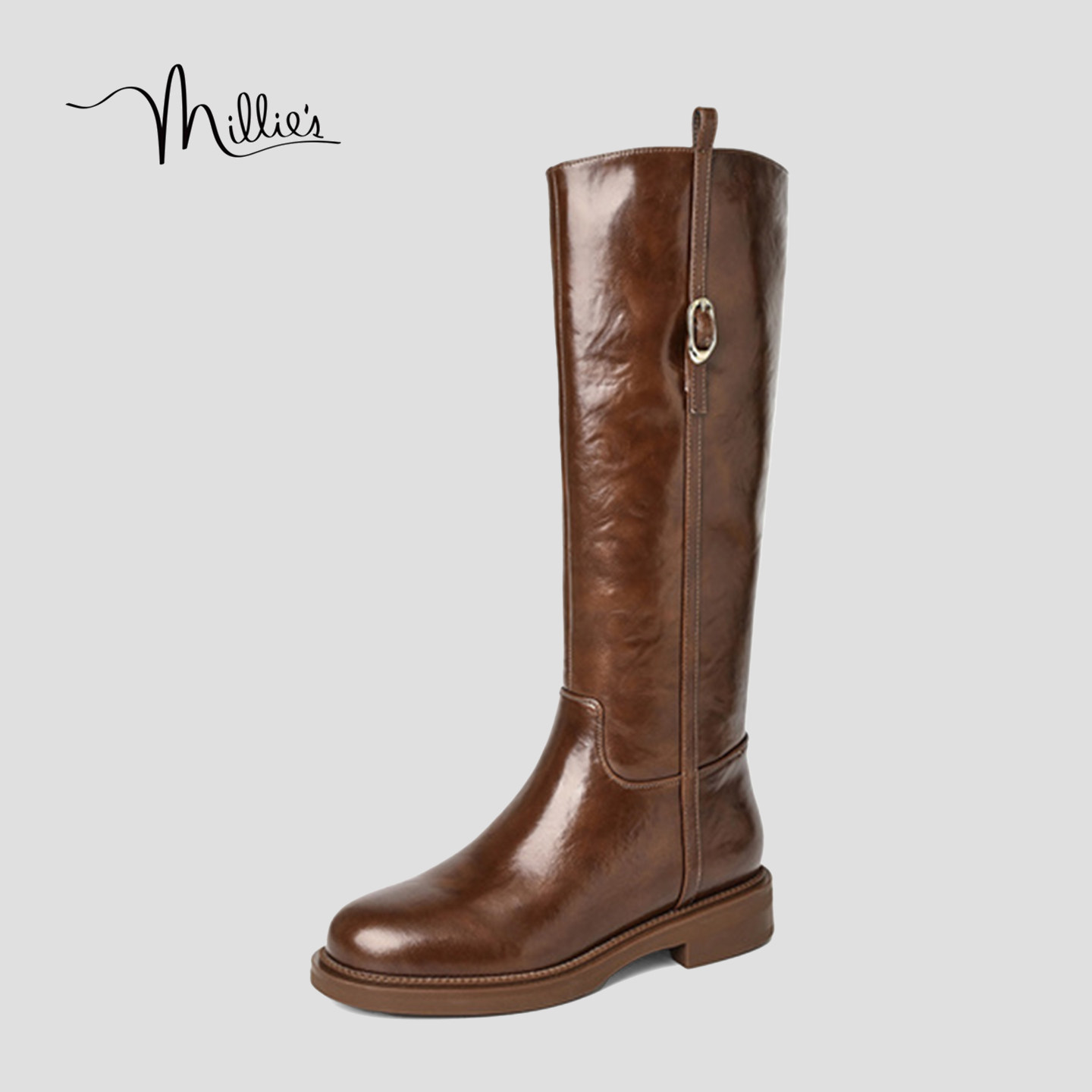 MILLIE'S/妙丽复古皮带扣长筒骑士靴女2025秋冬粗跟厚底高筒靴Q
