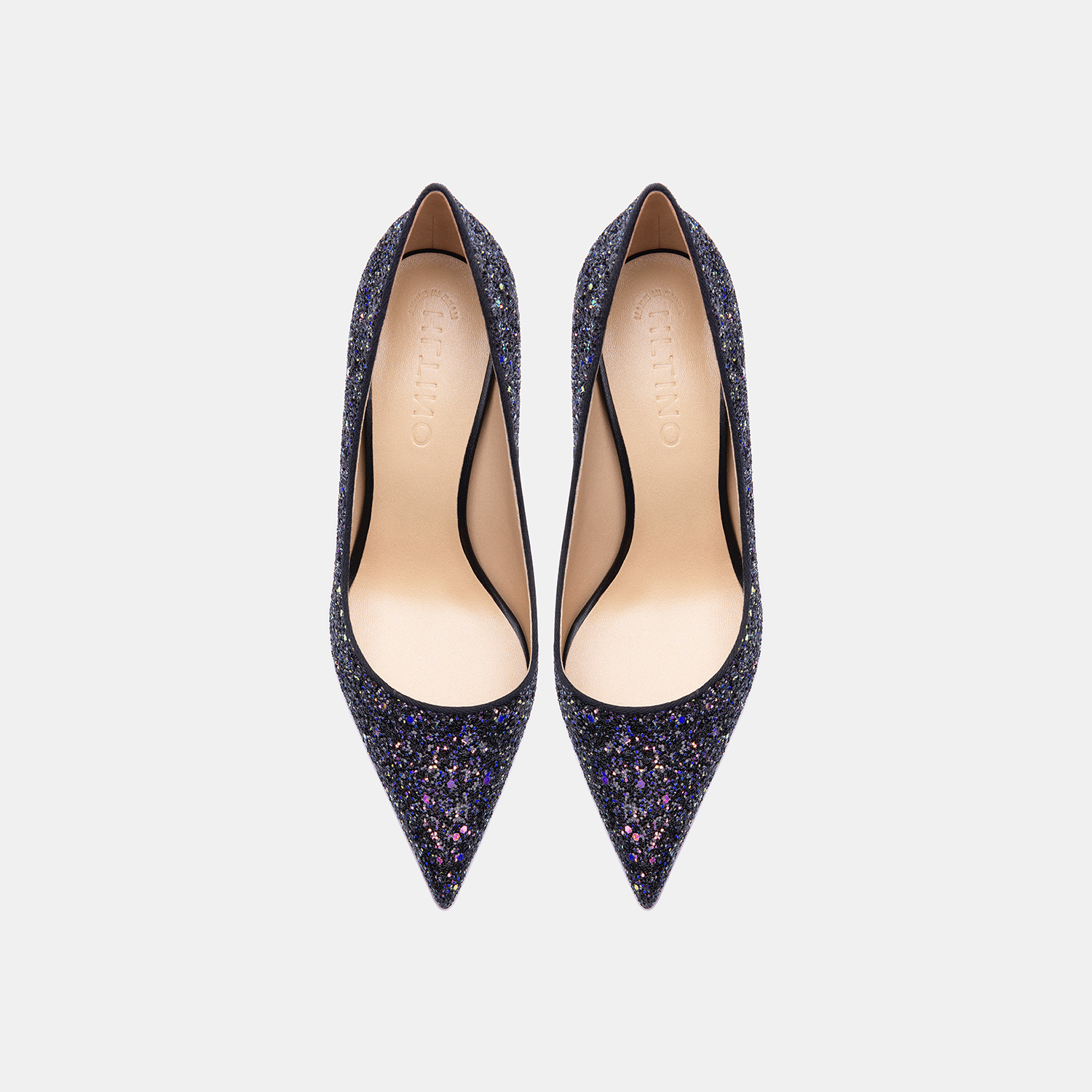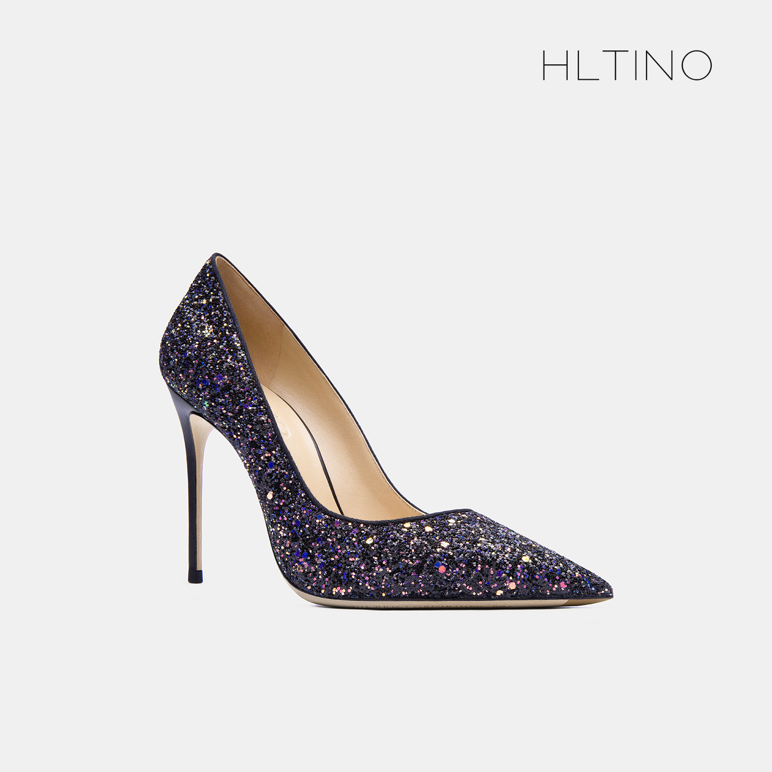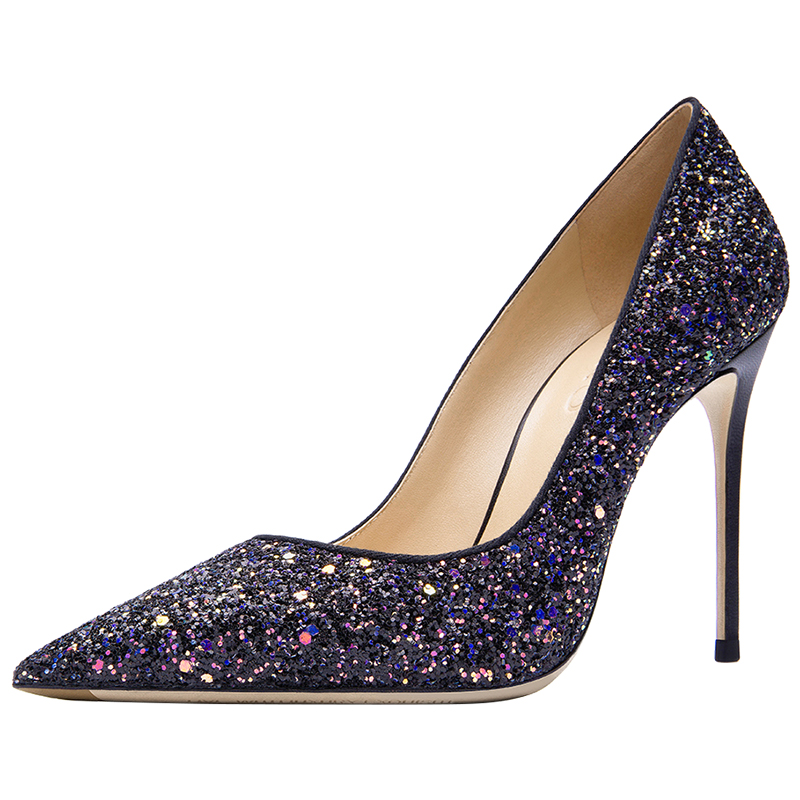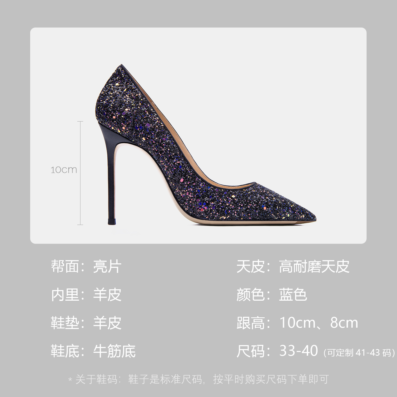 黑色高跟鞋女2025年春季新款细跟设计感小众尖头蓝色亮片浅口单鞋