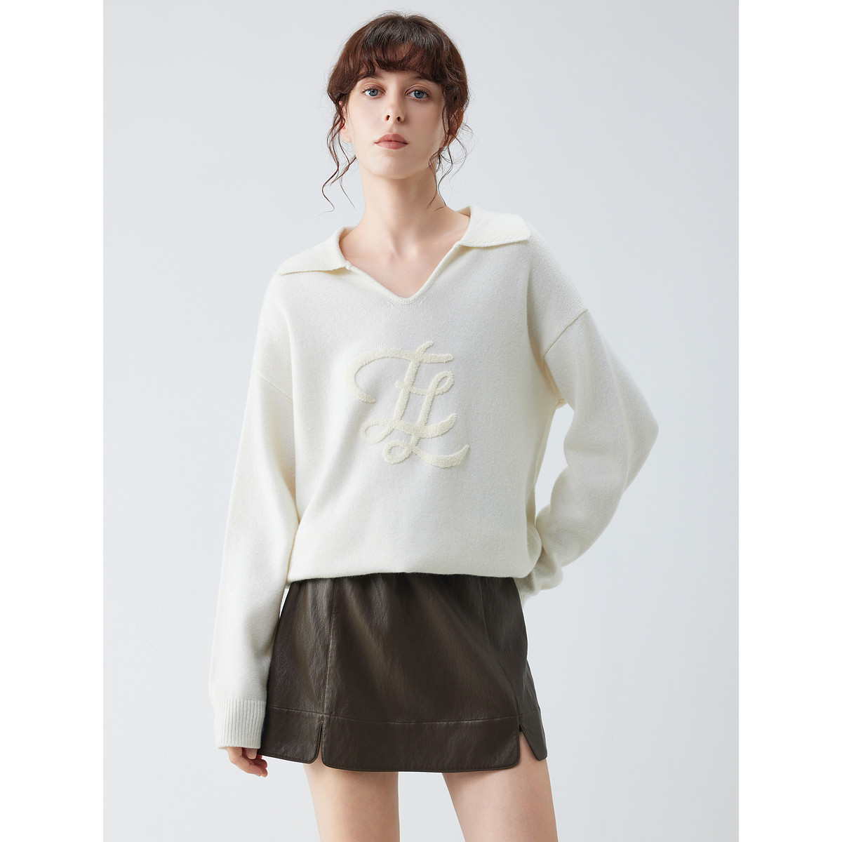 【自营】ELLE白色绵羊毛polo领针织衫女2025秋季新款套头软糯毛衣